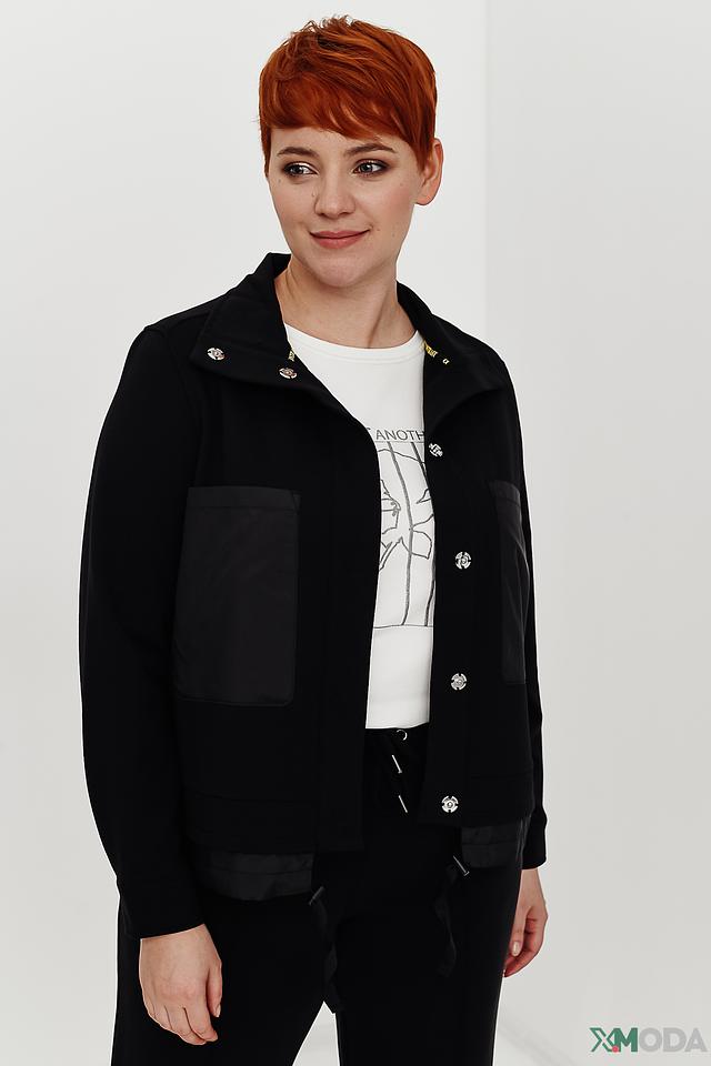 Жакет имеет оригинальный дизайн благодаря контрастным вставкам из гладкой ткани на груди и карманах. Застёжка на пуговицах обеспечивает удобство и надёжность. Длинные рукава и воротник-стойка добавляют образу элегантности.