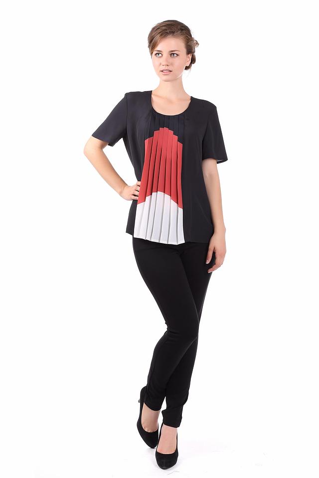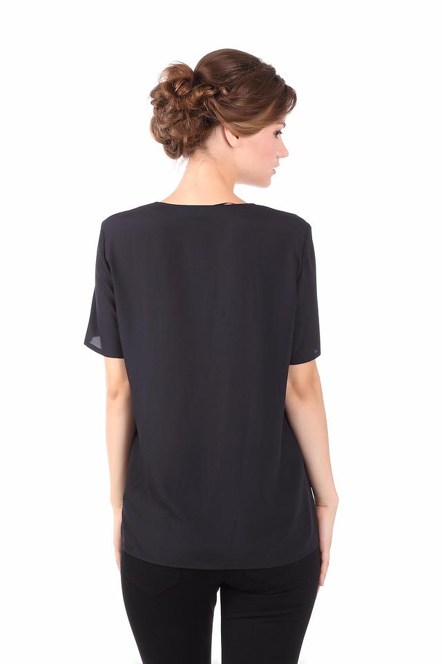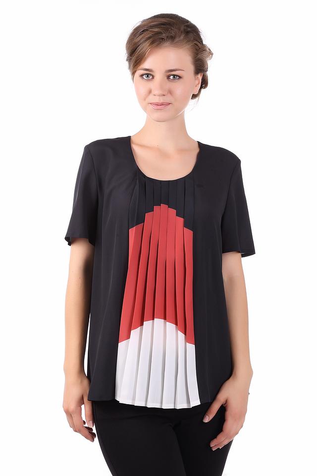 Модель имеет круглый вырез горловины и короткие рукава, что делает её идеальным выбором для тёплой погоды. Свободный крой обеспечивает комфортную посадку по фигуре и не сковывает движений. Блуза выполнена из 100% полиэстера, что гарантирует легкость, износостойкость и простоту в уходе.