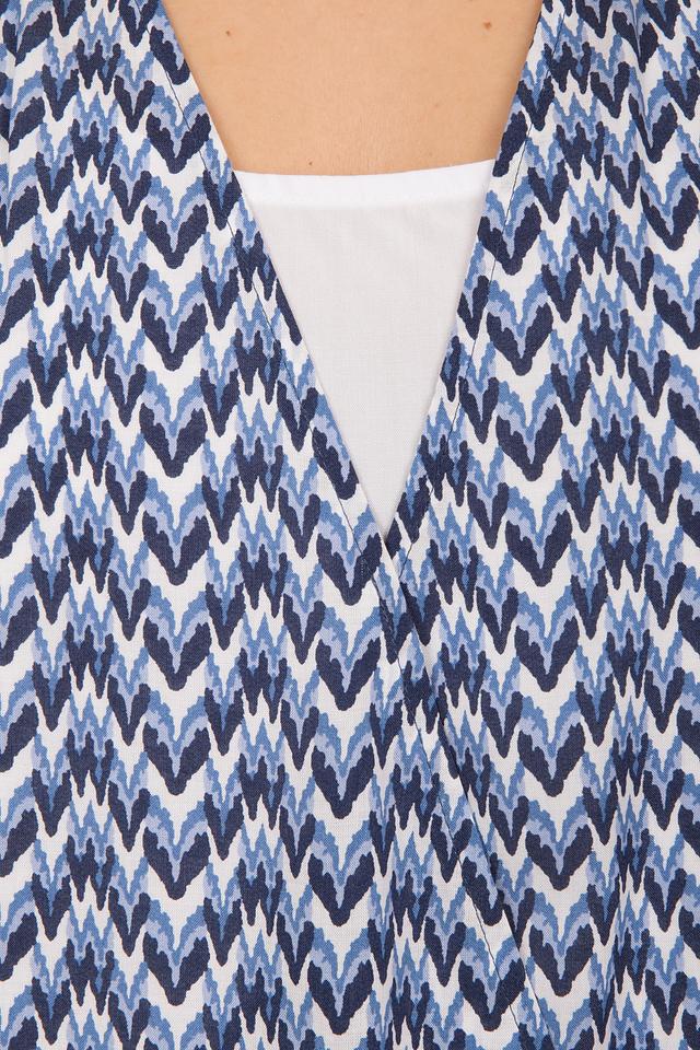 Особенностью данной модели является яркий и динамичный принт в виде зигзага, выполненный в сочетании синих и белых оттенков. V-образный вырез горловины добавляет образу женственности и легкости.