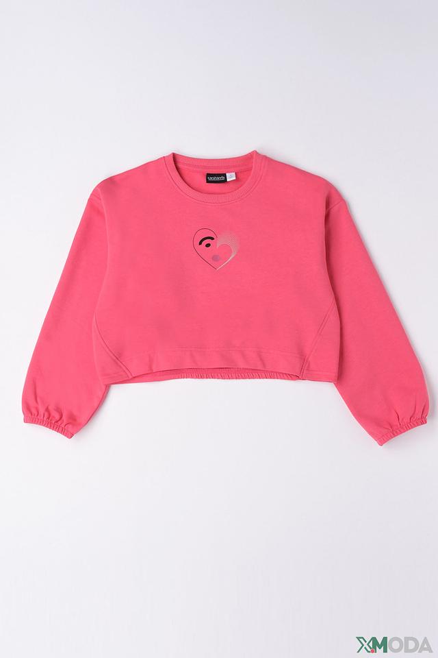 Джемпер имеет свободный крой, не сковывающий движения, и короткие рукава. На передней части изделия расположен милый принт в виде сердца с глазками, который придаёт ему игривый и забавный вид. Округлый вырез горловины и эластичные манжеты рукавов обеспечивают удобную посадку.