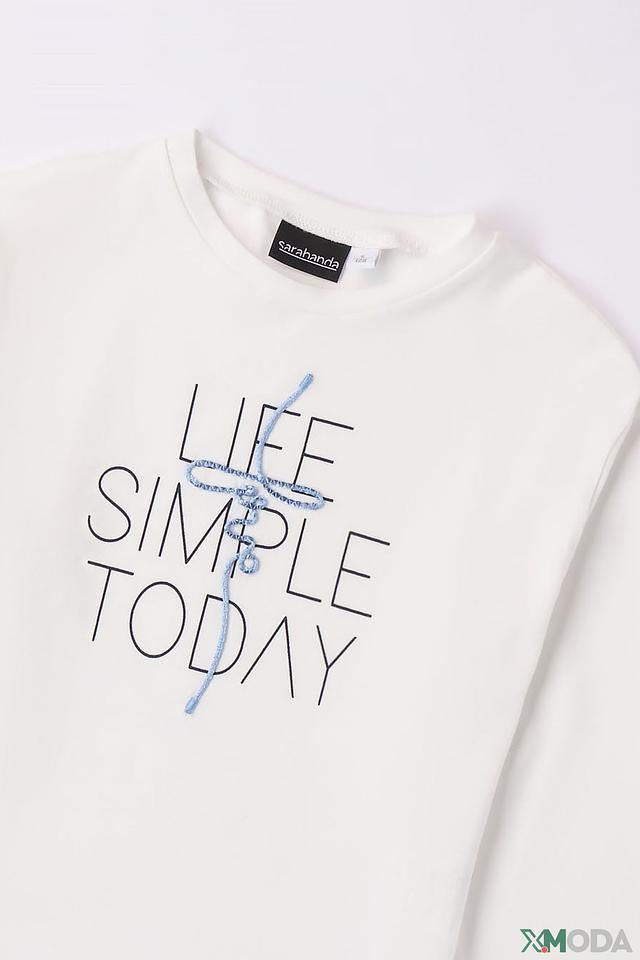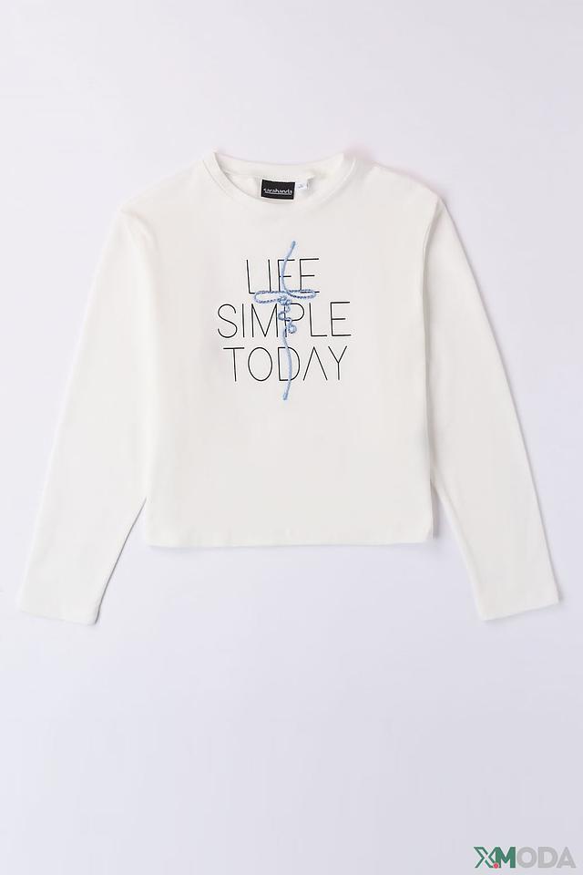 Джемпер Sarabanda для девочки, белого цвета, с оригинальным принтом "LIFE SIMPLE TODAY". Изготовлен из мягкого хлопка с добавлением эластана для комфорта и свободы движений. Идеально подходит для повседневной носки. Состав: хлопок 95%, эластан 5%