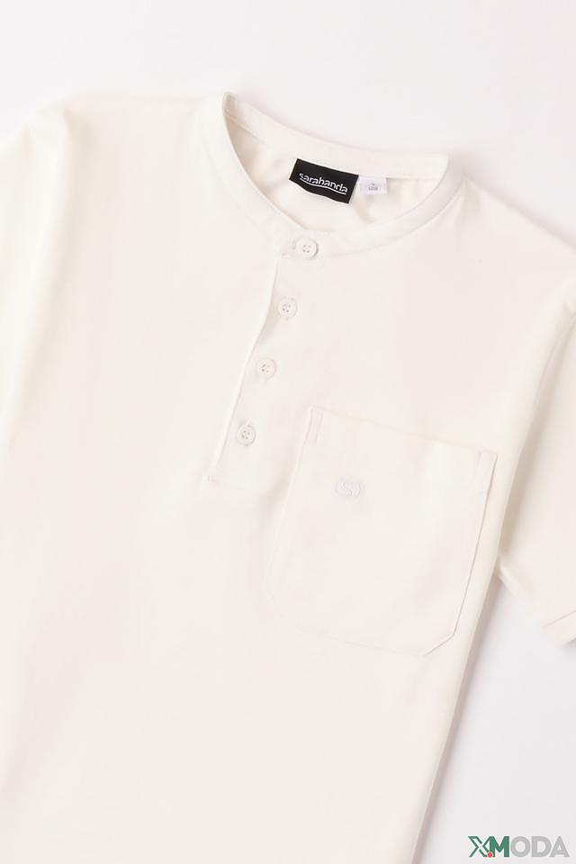 Кремовая футболка Sarabanda для мальчика с короткими рукавами и планкой на пуговицах. Изготовлена из мягкого хлопка с добавлением эластана для комфорта и свободы движений. Отличный выбор для повседневной носки. Состав: хлопок 95%, эластан 5%