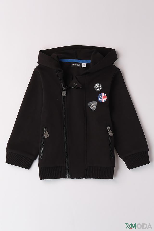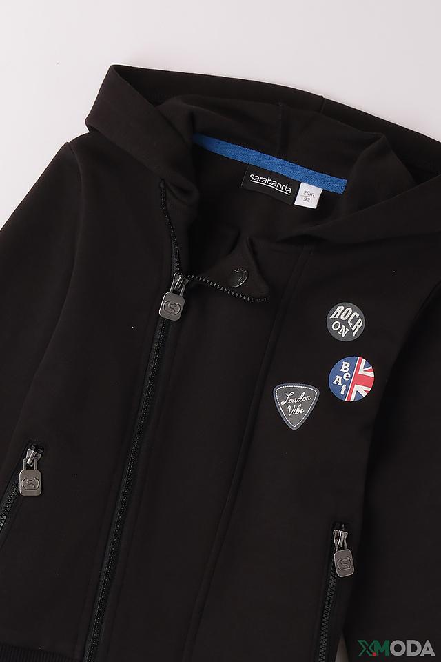 Чёрный кардиган Sarabanda для мальчика с застёжкой на молнии и декоративными нашивками. Модель выполнена из мягкого и приятного к телу сочетания полиэстера, хлопка и эластана, обеспечивающего комфорт и свободу движений. Состав: полиэстер 50%, хлопок 43%, эластан 7%