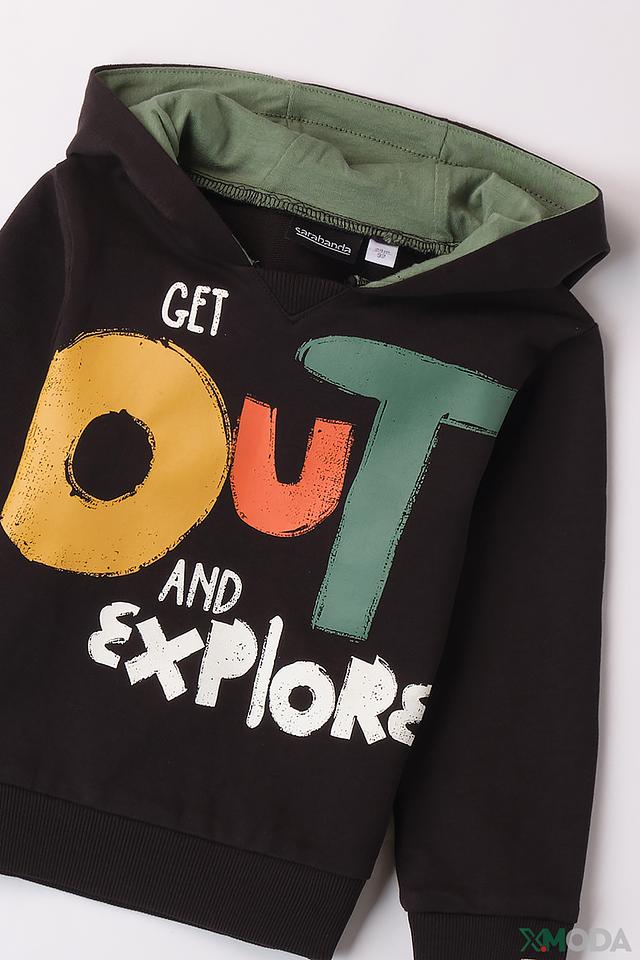 Джемпер украшен ярким и привлекательным принтом с надписью "Get Out and Explore", выполненным в различных цветах. Капюшон добавляет практичности и защищает от ветра. Манжеты и нижний край джемпера выполнены из эластичной резинки, обеспечивая плотное прилегание.