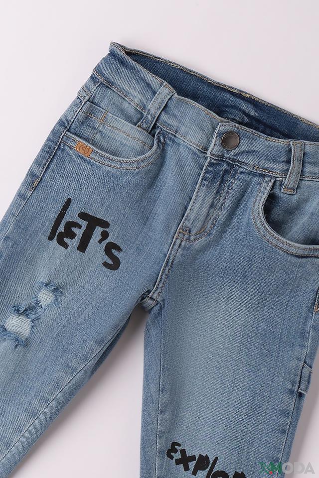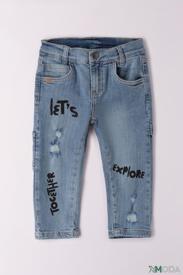 Эти джинсы от Sarabanda станут отличным дополнением к гардеробу вашего мальчика. Модель выполнена в классическом голубом цвете с эффектными потертостями и принтами "Let's" и "Explore", что придает им современный и динамичный вид.