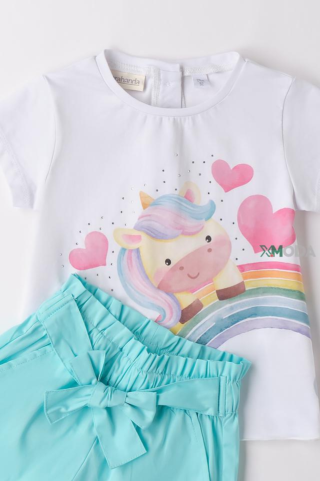 Футболка белого цвета, украшена красочным принтом с изображением милого единорога и розовыми сердечками. Короткие рукава и удобный крой обеспечивают свободу движений. Шорты мятного цвета, с эластичным поясом и небольшим пояском, дополняют образ.