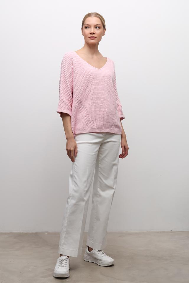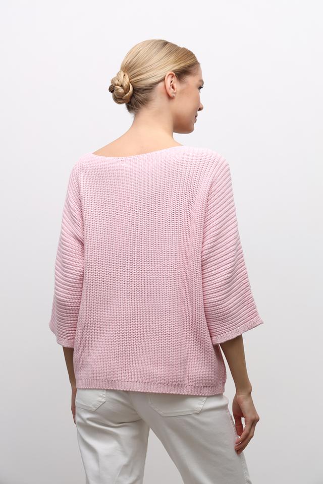 Рукава 3/4 делают этот пуловер универсальным – он подойдет как для теплой погоды, так и для прохладных вечеров. Свободный крой обеспечивает комфорт и свободу движений.