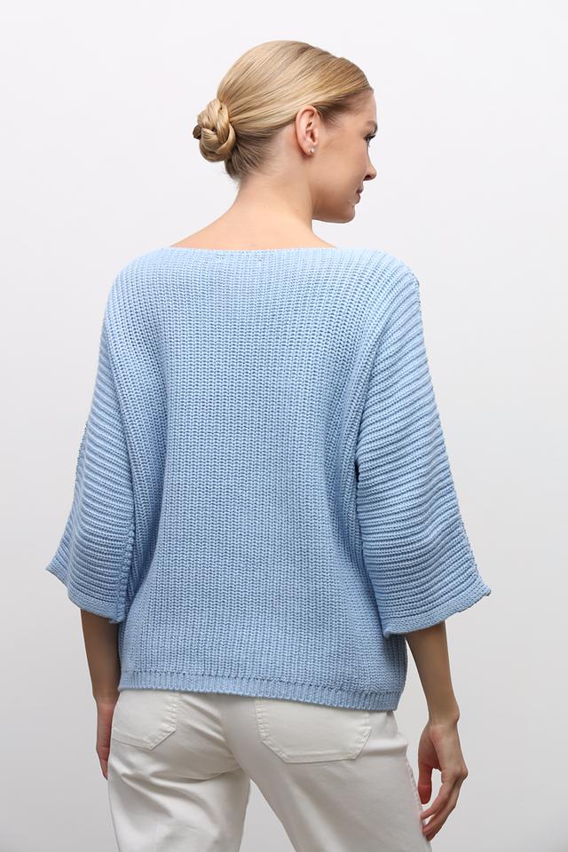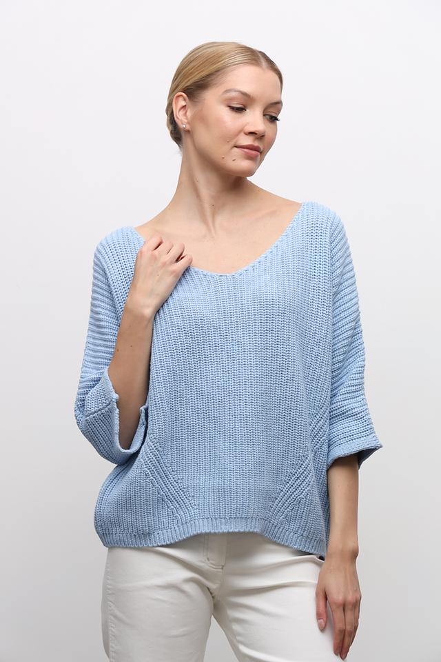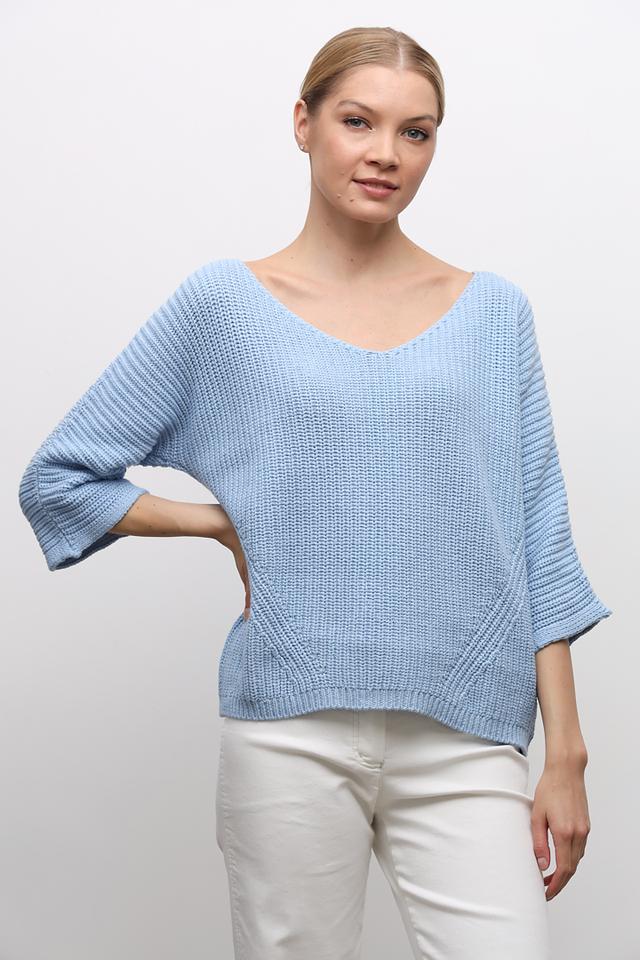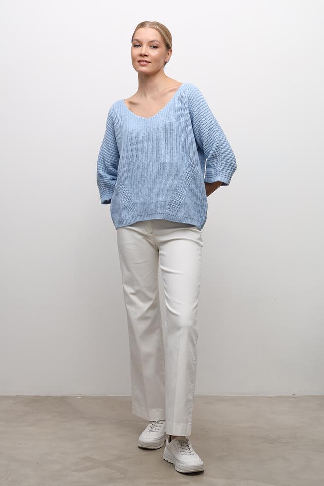 Женский пуловер SE Stenau голубого цвета с рукавом 3/4 выполнен из мягкого трикотажа. Модель имеет V-образный вырез и свободный крой, что обеспечивает комфорт и удобство в носке. Состав: хлопок 50%, полиакрил 50%