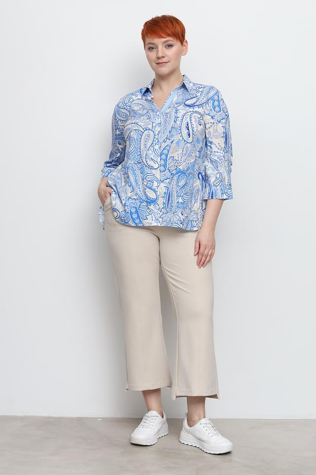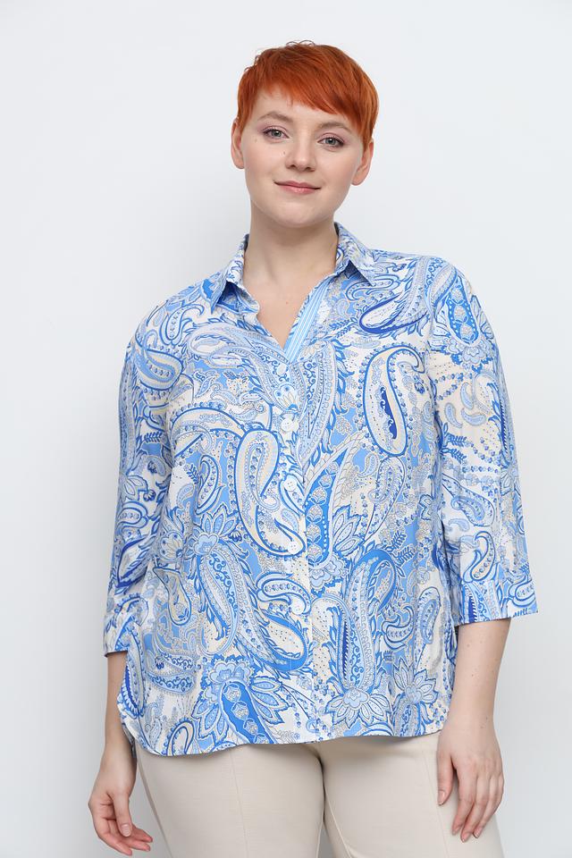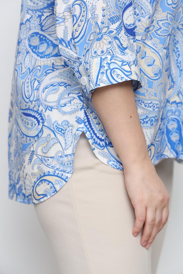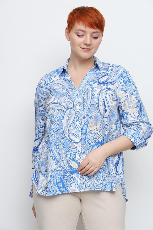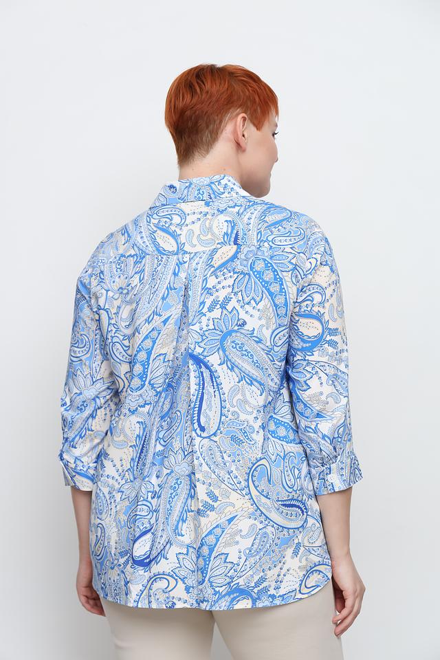 Рубашка имеет классический крой с воротником и застежкой на пуговицы. Особенностью модели является яркий узор пейсли в голубых и белых тонах, который придает ей индивидуальность и шарм.