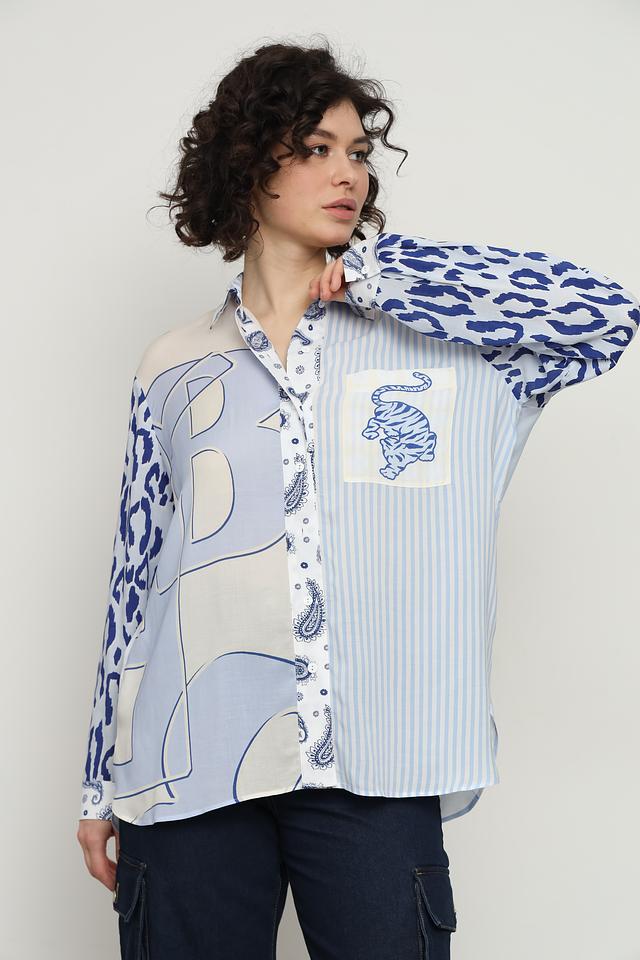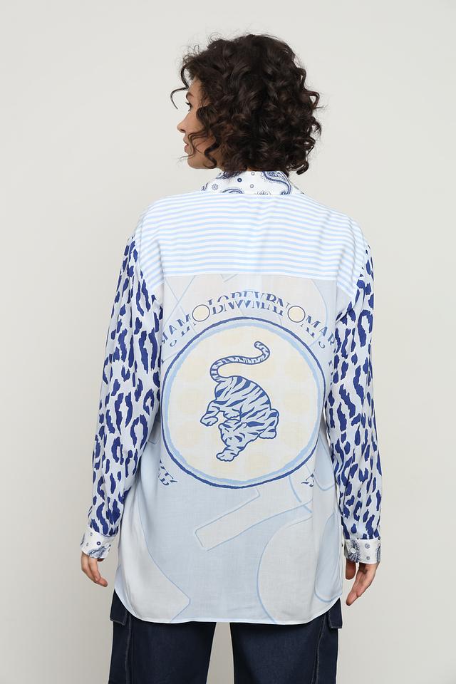 Рубашка выполнена в сочетании нескольких принтов: полоска, пейсли и леопард, а также украшена изображением тигра на нагрудном кармане и спине. Такое сочетание делает ее уникальной и привлекательной.