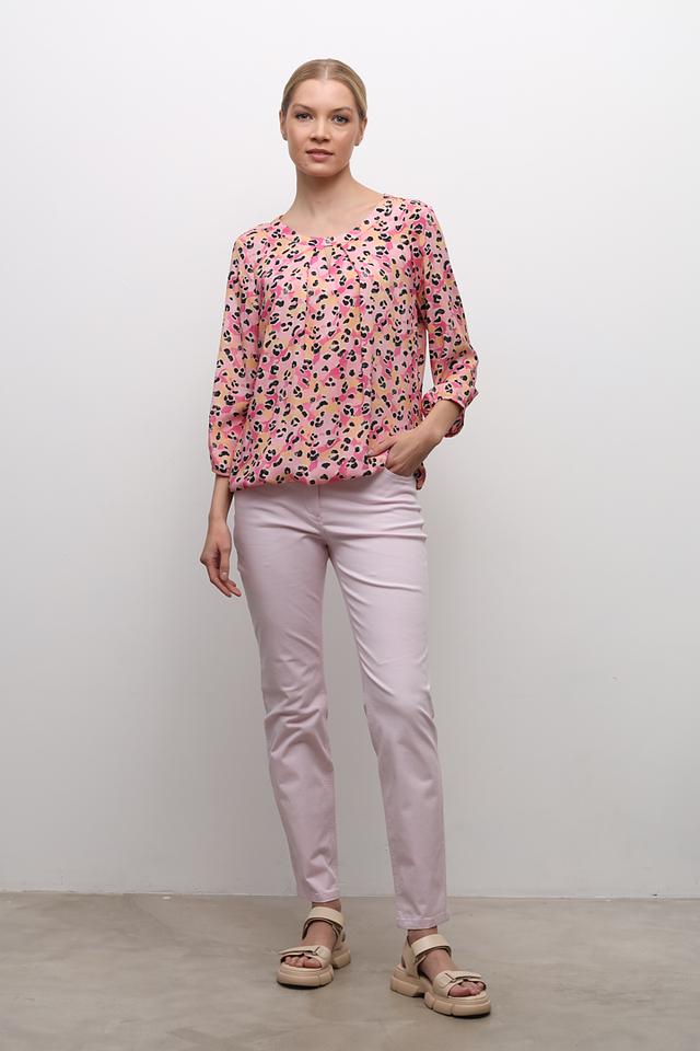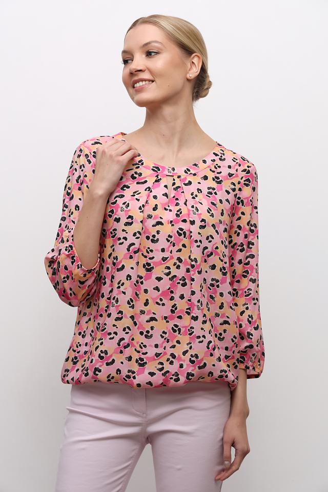 Особенностью данной модели является оригинальный леопардовый принт в розово-оранжевой гамме. Блуза имеет округлый вырез горловины и рукава длиной 3/4 с небольшими сборками по краям, что придает ей романтичный вид.