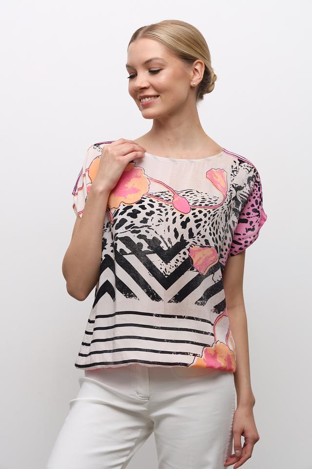 Особенностью данной модели является оригинальный принт, сочетающий в себе абстрактные элементы, геометрические фигуры и цветочные мотивы в розово-чёрно-белой гамме. Круглый вырез горловины и короткие рукава делают блузу универсальной и подходящей для различных случаев.