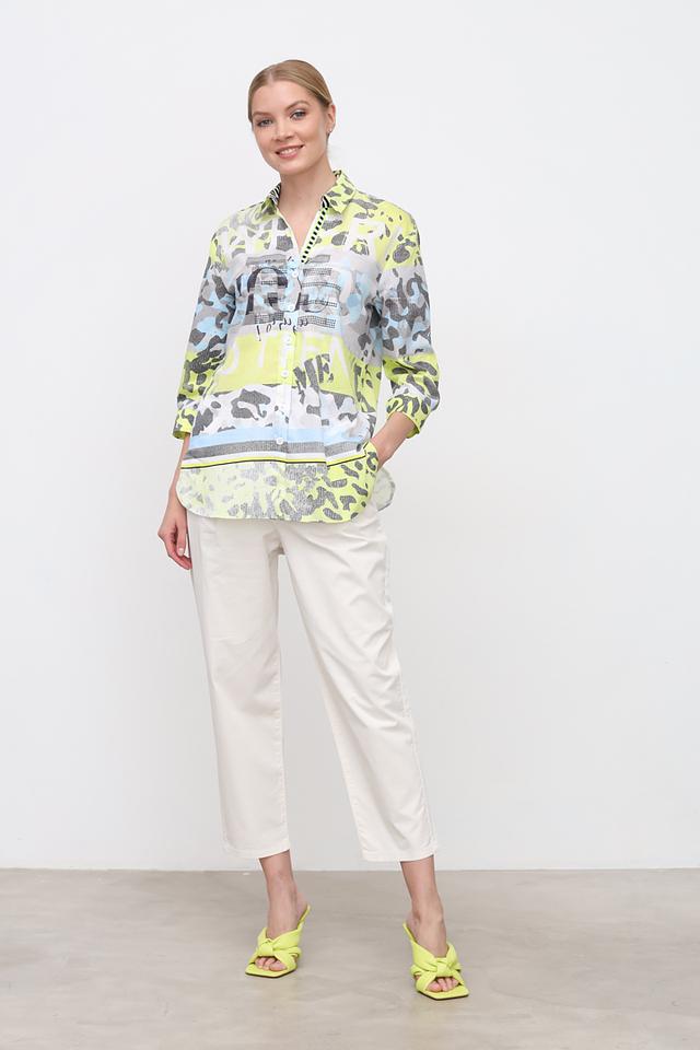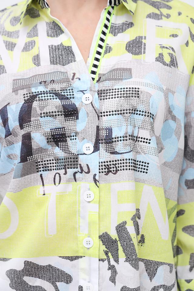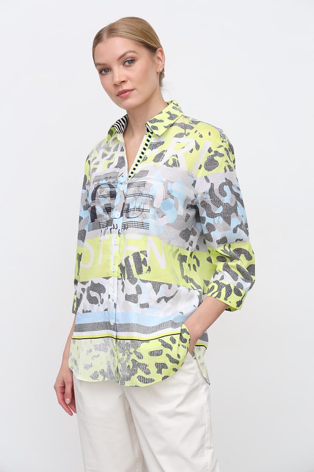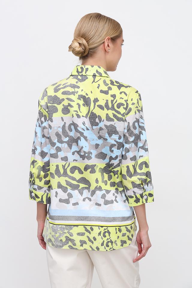 Особенностью данной модели является яркий и необычный принт, сочетающий в себе оттенки лайма, голубого, серого и белого. Этот принт добавляет блузе оригинальности и позволяет выделиться из толпы.