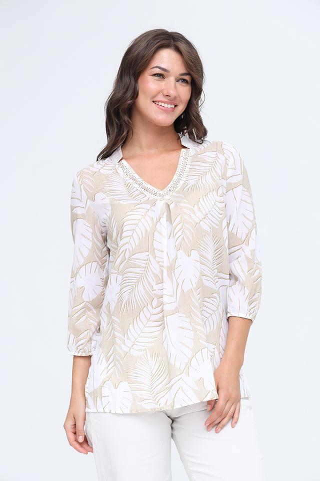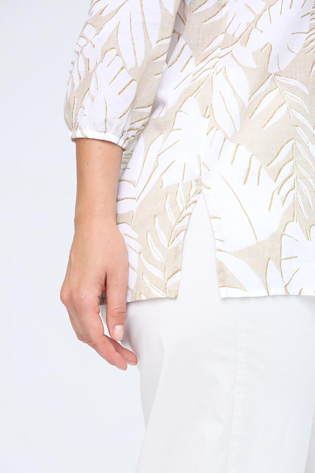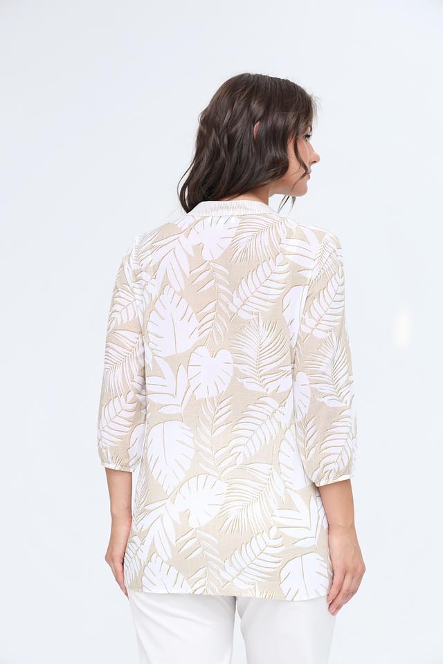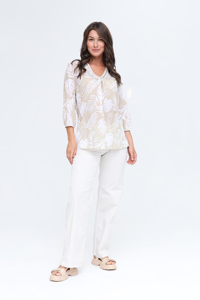 Основной цвет блузы – бежевый, а принт выполнен в виде стилизованных белых листьев. Такая комбинация цветов делает блузу универсальной и легко сочетаемой с различными элементами гардероба. Эта блуза идеально подойдет для создания повседневных и офисных образов.