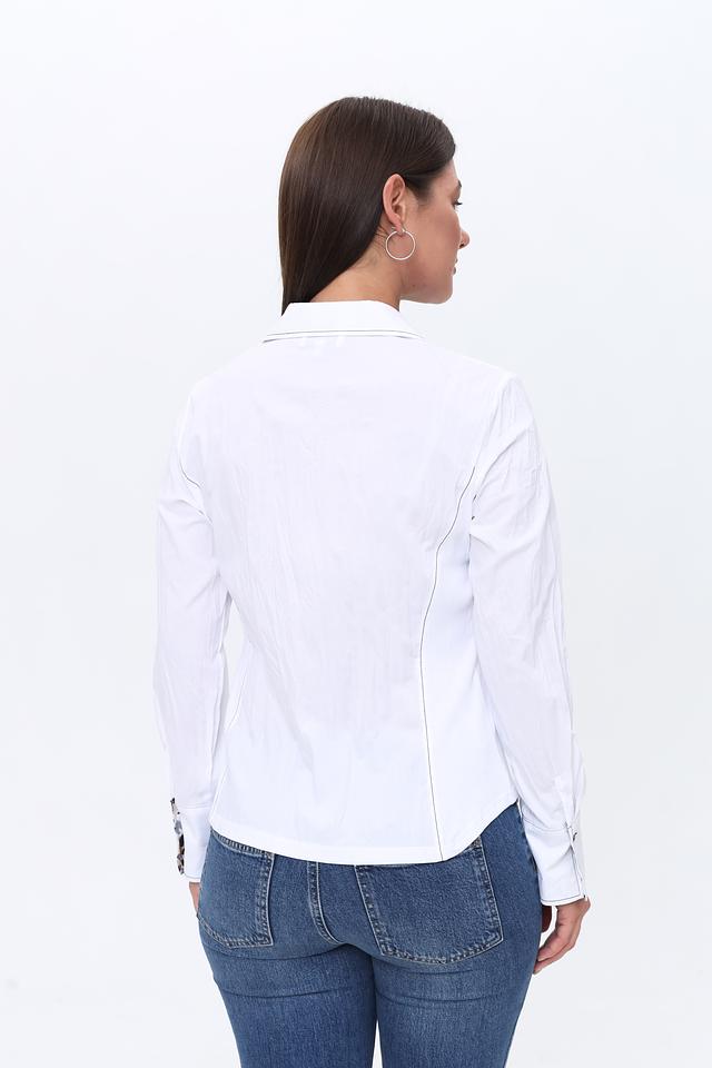 Рубашка имеет классический крой с длинными рукавами и отложным воротником. Застежка на пуговицах по всей длине. Сочетание полиэстера (65%) и хлопка (35%) обеспечивает комфорт в носке, легкость ухода и устойчивость к сминанию.