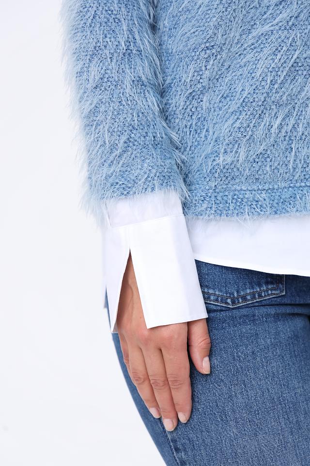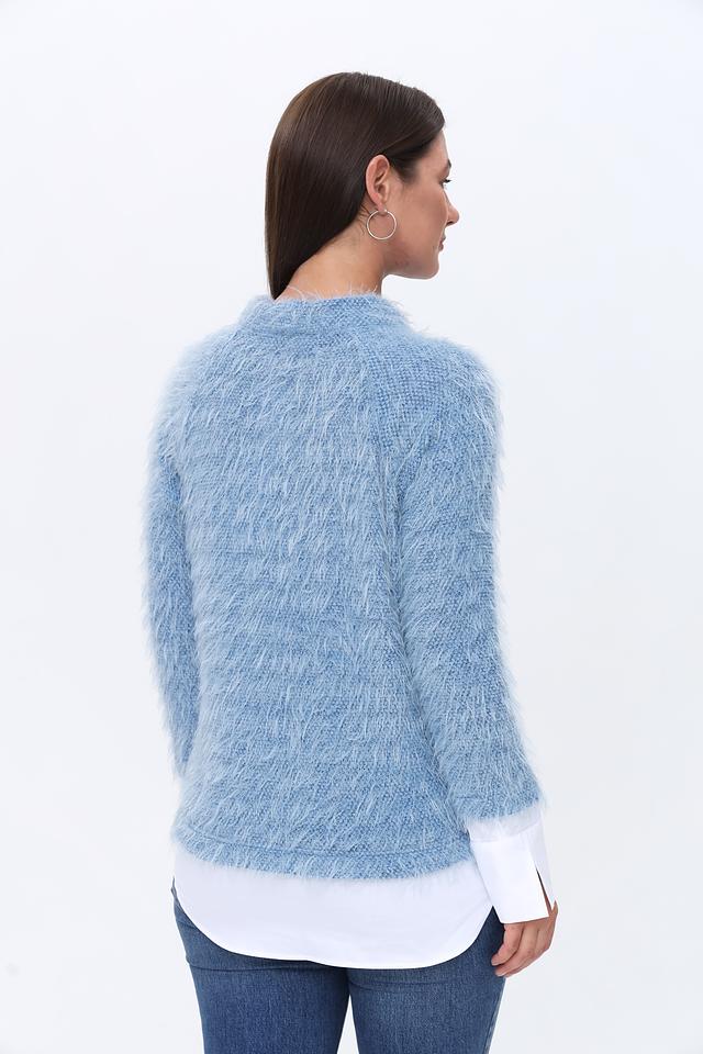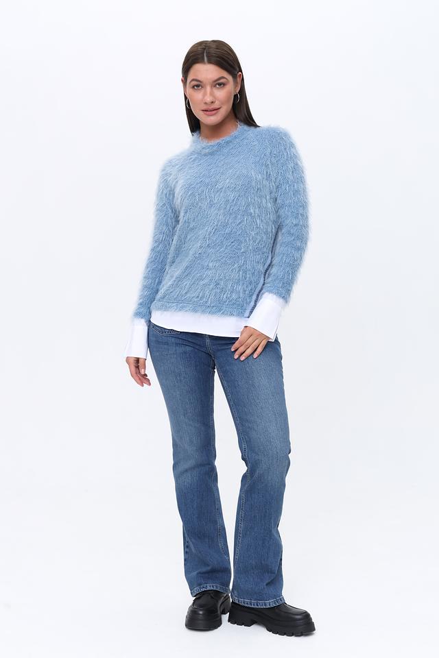 Пуловер имеет нежный голубой цвет и фактурную, "пушистую" вязку, которая придает ему особый шарм. Округлый вырез горловины и свободный силуэт делают его универсальным и подходящим для различных стилей.