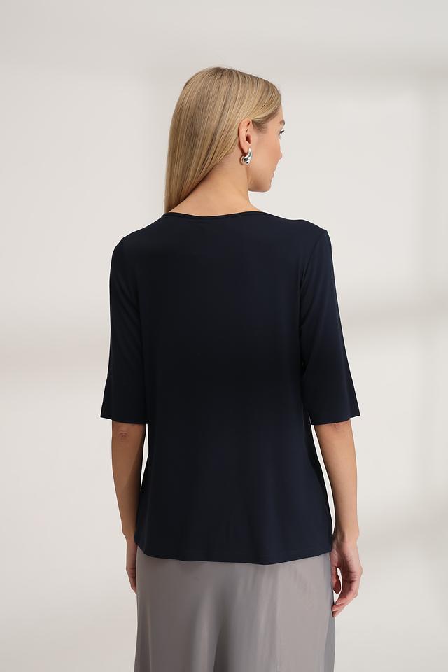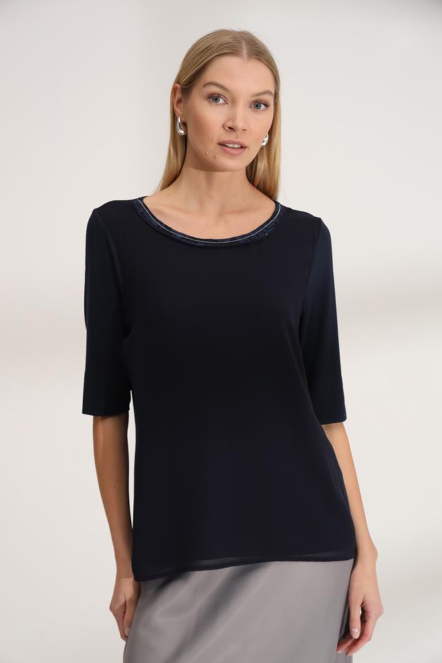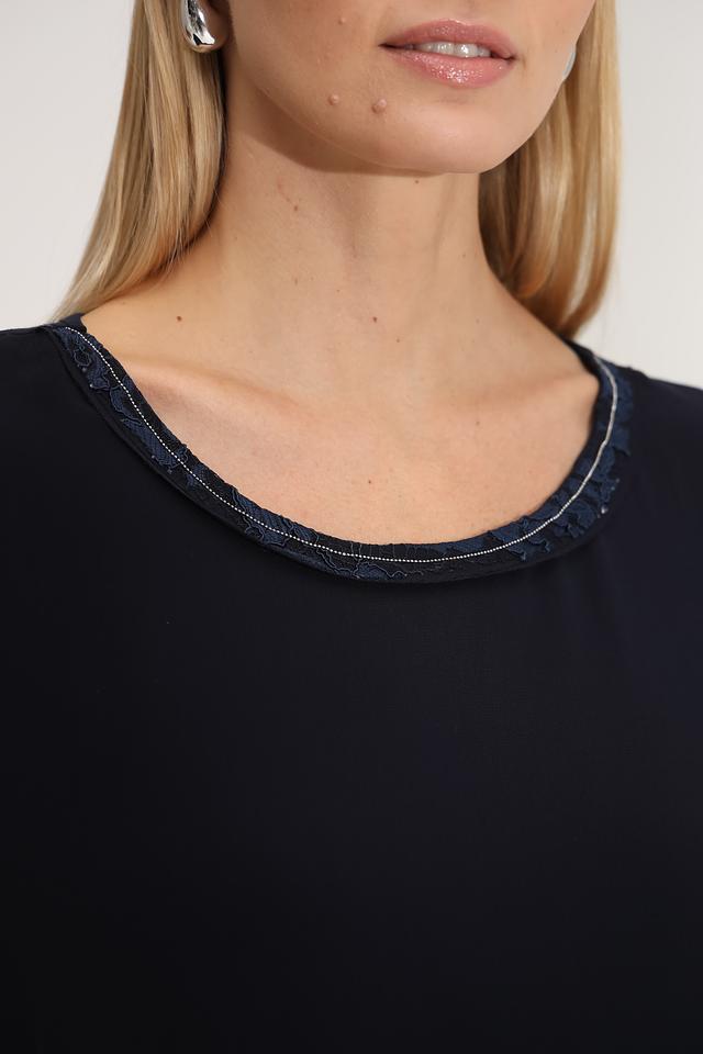 Тёмно-синяя блуза от SE Stenau с округлым вырезом, декорированным кружевом. Изготовлена из мягкой вискозы с добавлением эластана для комфорта и хорошей посадки. Состав: вискоза 96%, эластан 4%