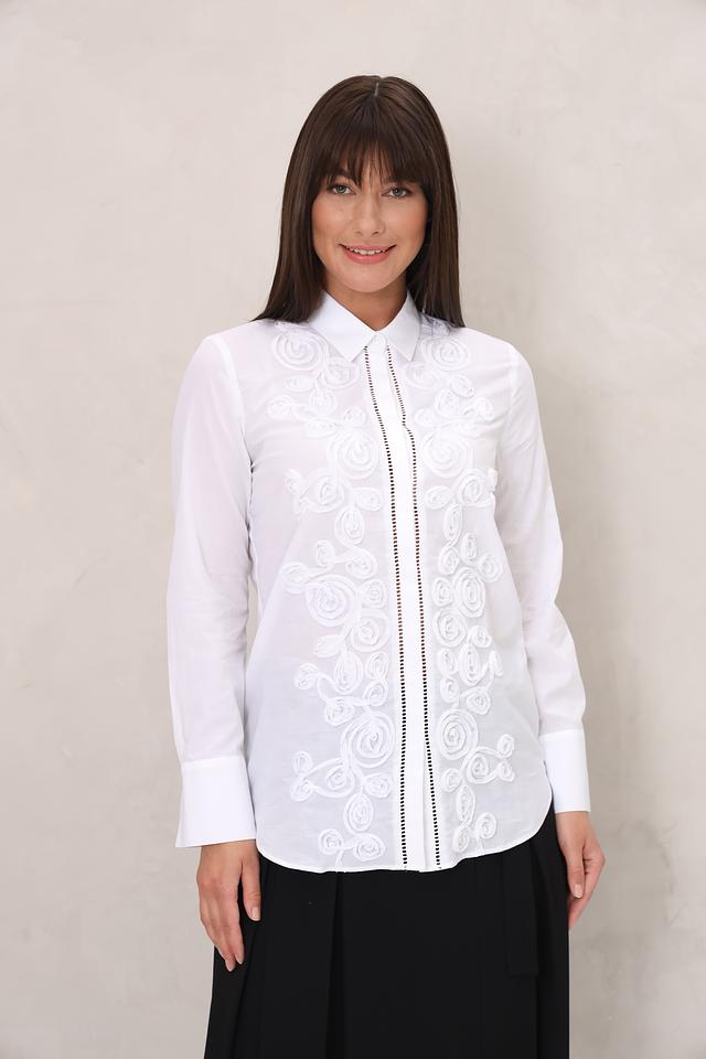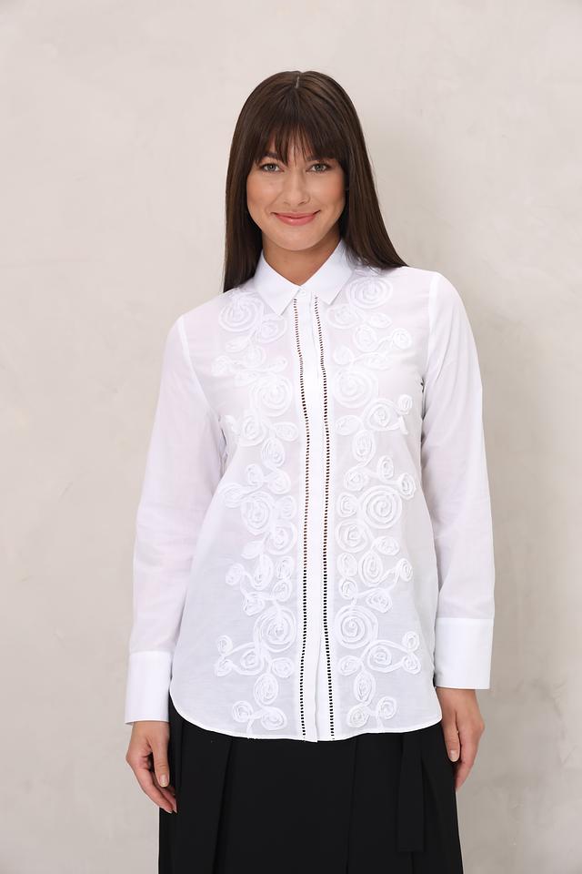 Особенностью данной модели является изысканная вышивка в виде цветочных мотивов, расположенная на передней части блузы. Вышивка придает изделию романтичный и утонченный вид. Блуза имеет классический крой с длинными рукавами и отложным воротником.