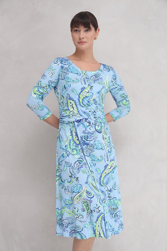Это стильное платье от бренда SE Stenau выполнено в нежном голубом цвете и украшено оригинальным принтом пейсли. Платье имеет длину миди и приталенный силуэт, который подчеркивает достоинства фигуры.