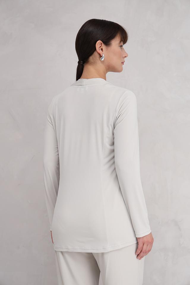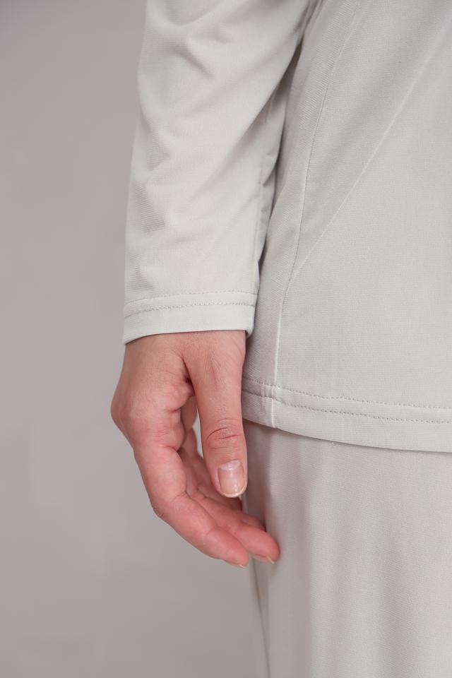 Блуза имеет длинные рукава и свободный крой, обеспечивающий комфорт в носке. Она выполнена из высококачественного полиэстера с небольшим добавлением эластана, что делает ее приятной на ощупь и устойчивой к сминанию.