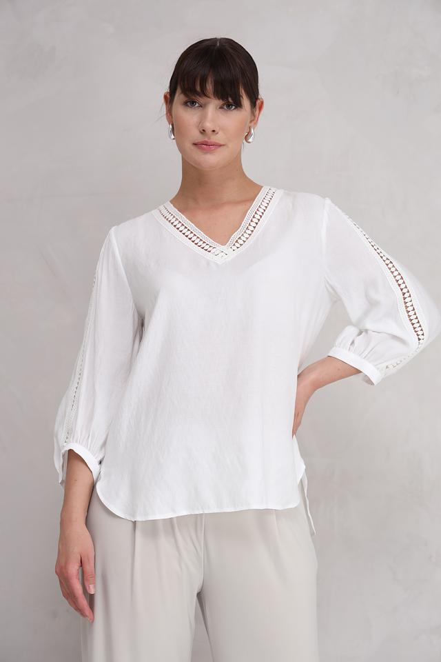 Белая блуза SE Stenau с изящным кружевным декором станет прекрасным дополнением к вашему гардеробу. Модель выполнена из лёгкой ткани, имеет V-образный вырез и рукава 3/4 с кружевной отделкой. Состав: вискоза 55%, полиэстер 45%