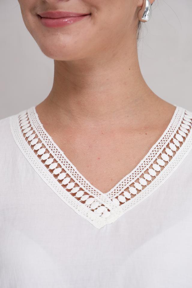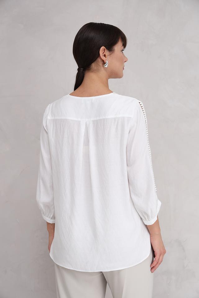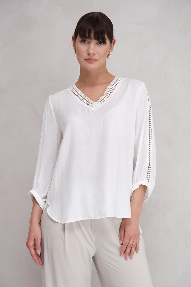 Блуза украшена изысканным кружевом по вырезу горловины и на рукавах, что придает ей особый шарм. V-образный вырез подчеркивает линию шеи и делает образ более открытым.