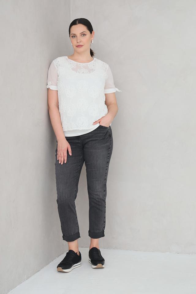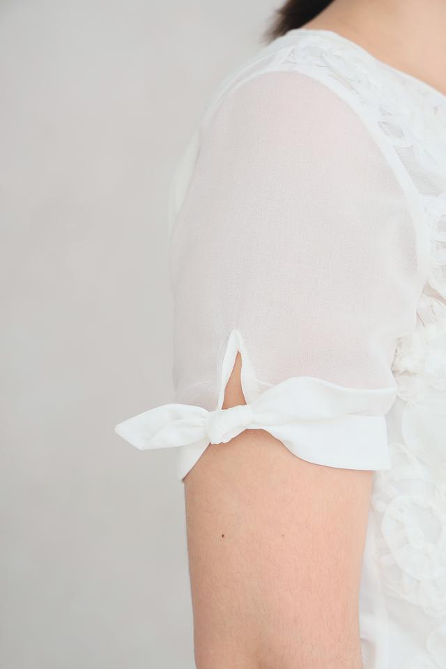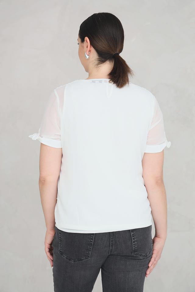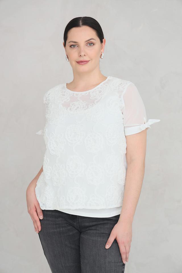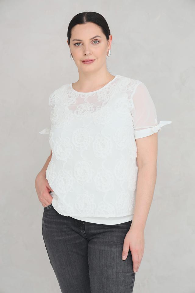 Блуза отличается изысканным дизайном: верхняя часть и рукава выполнены из нежного кружева, создающего эффект воздушности и прозрачности. Короткие рукава дополнены аккуратными завязками, которые можно регулировать по длине, придавая блузе индивидуальность.