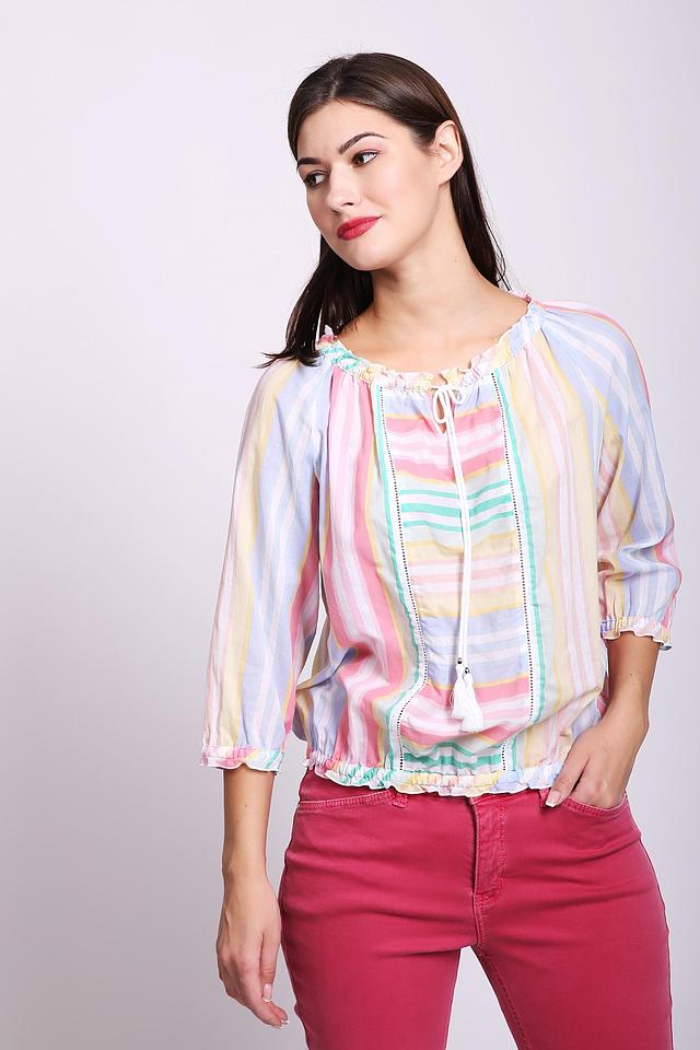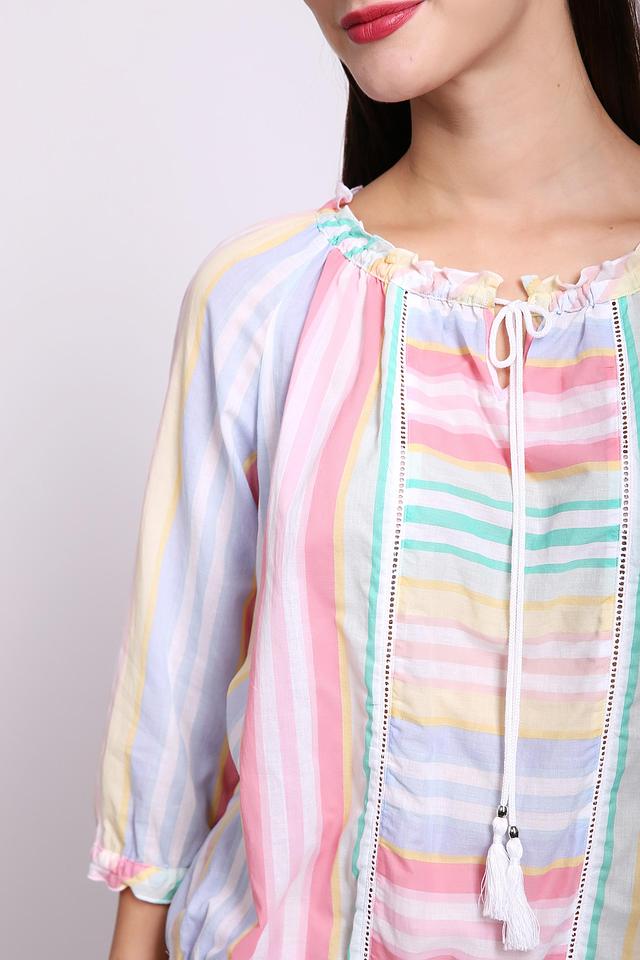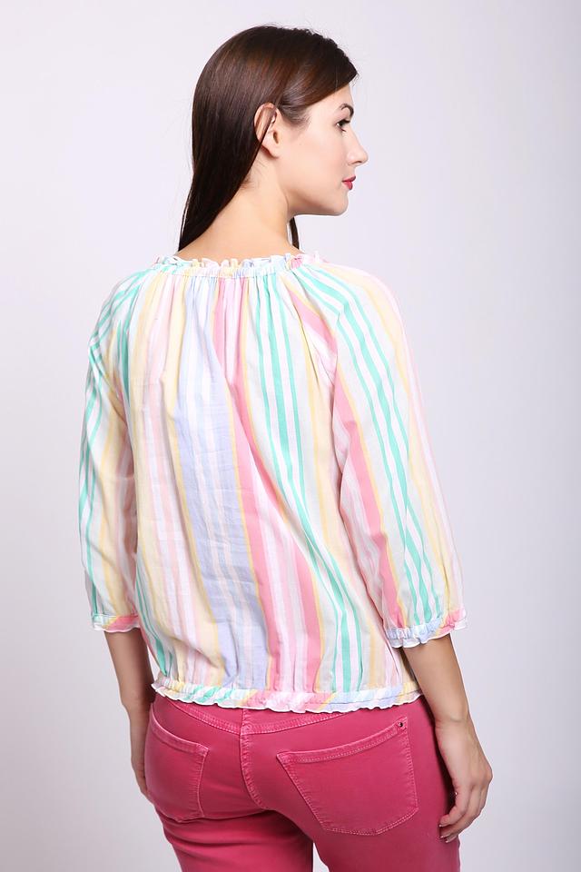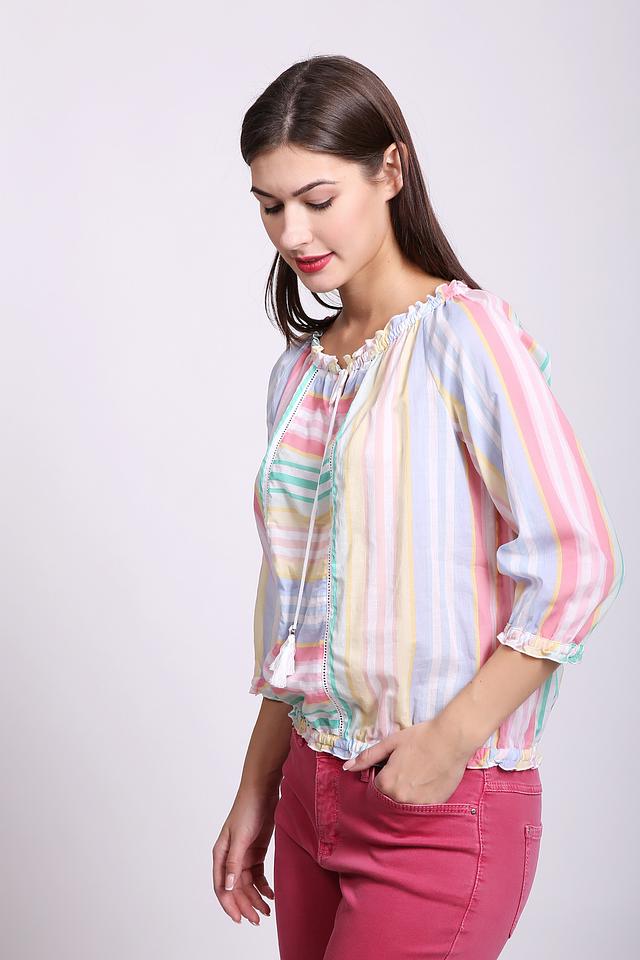 Блуза имеет свободный крой, короткие рукава с воланами и округлый вырез горловины, дополненный завязками с кисточками. Верхняя часть блузы украшена ярким разноцветным рисунком в полоску, состоящим из множества оттенков.