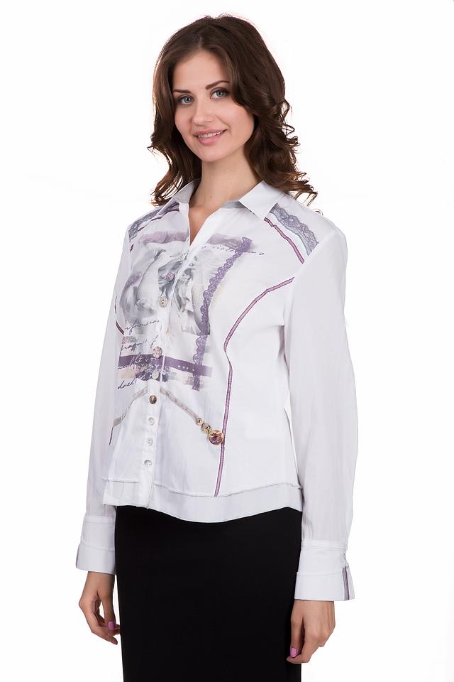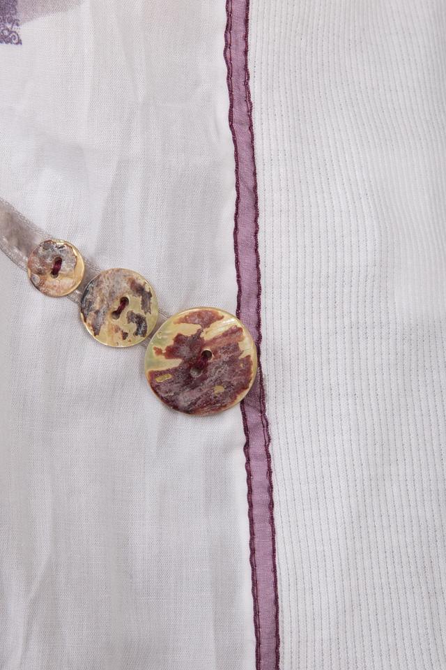 Блуза имеет классический крой с длинными рукавами и отложным воротником. Застежка осуществляется на пуговицы, которые также являются декоративным элементом благодаря своей оригинальной форме и текстуре.