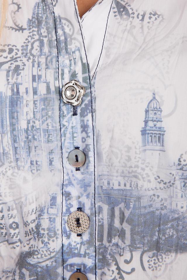 Эта элегантная блуза от SE Stenau выполнена в белом цвете и украшена уникальным принтом с изображением городских пейзажей. Модель имеет классический крой с длинными рукавами и воротником-стойкой.