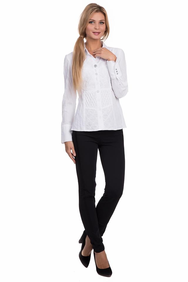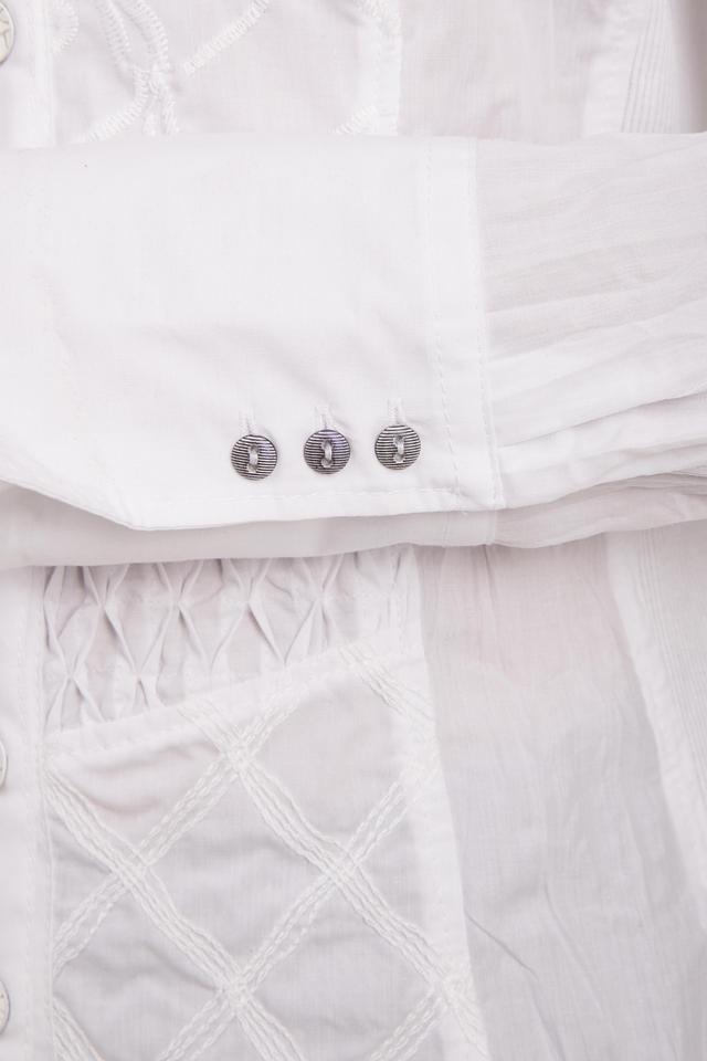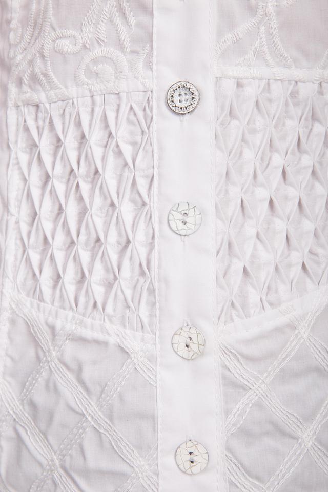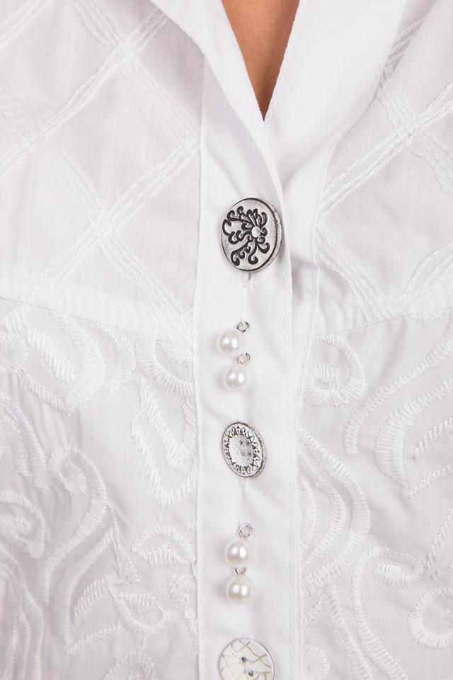 Передняя часть блузы украшена изысканной вышивкой, придающей ей особый шарм. Пуговицы выполнены в оригинальном дизайне, что добавляет блузе индивидуальности. Рукава блузы – длинные, с манжетами на пуговицах.