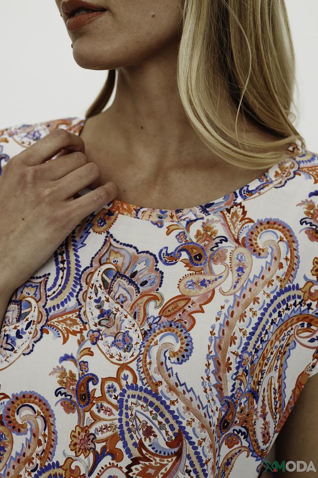 Основной цвет блузы – голубой, но она украшена красочным узором пейсли в оранжевых, белых и синих тонах. Круглый вырез горловины и короткие рукава с небольшими воланами придают блузе легкость и непринужденность.