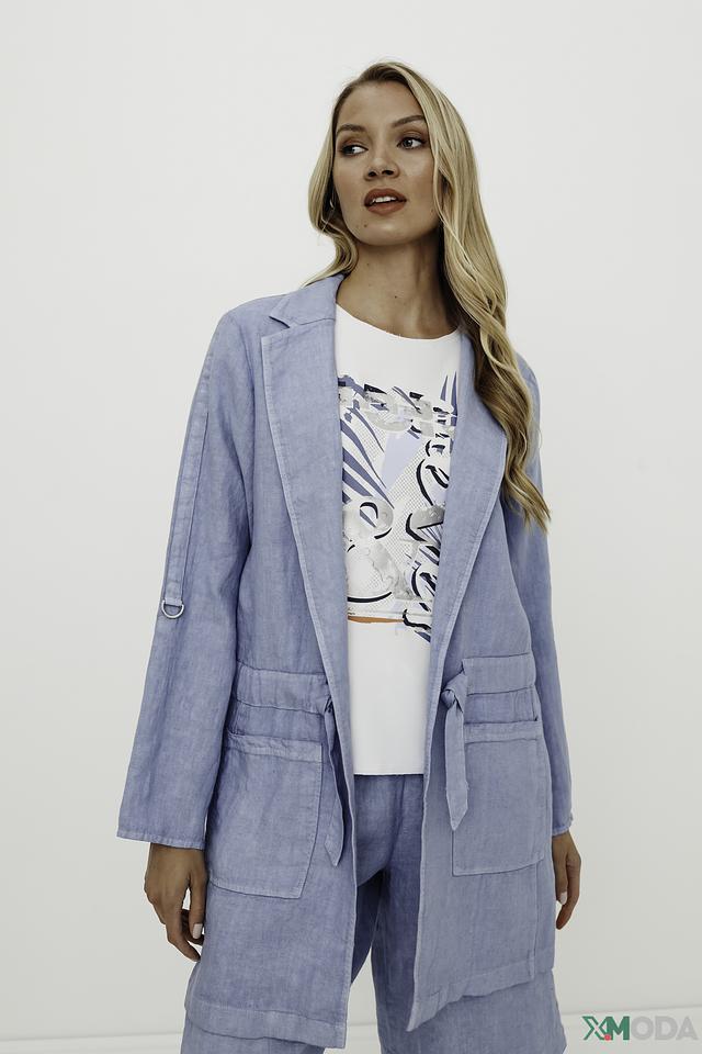 Особенностью данной модели является пояс, который можно завязать на талии, чтобы подчеркнуть фигуру. Жакет имеет два функциональных кармана. Голубой цвет жакета легко сочетается с различными элементами гардероба, создавая стильные и разнообразные образы.