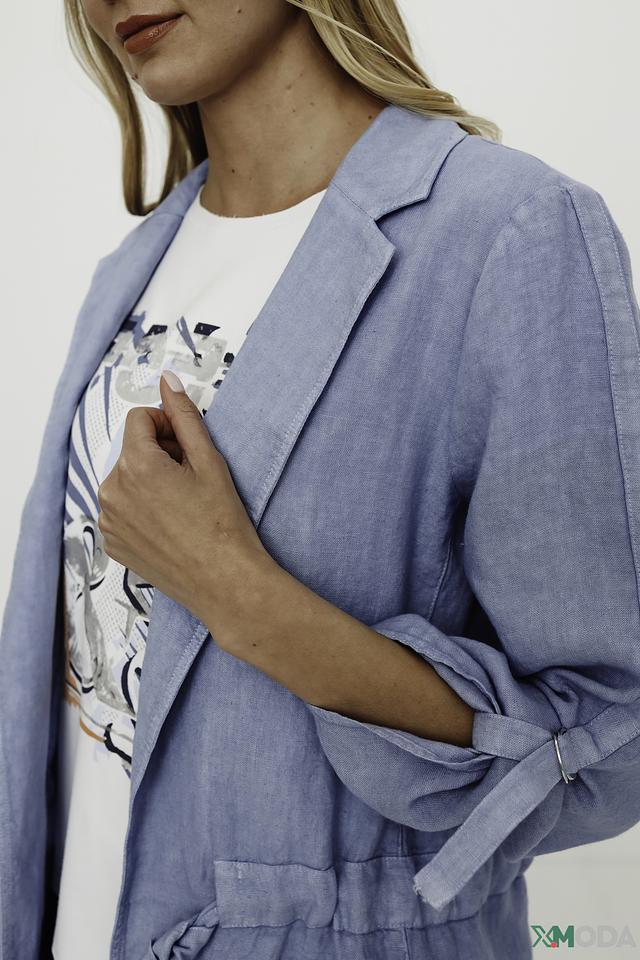 Жакет SE Stenau голубого цвета выполнен из 100% льна. Модель прямого кроя с лацканами, рукавами 3/4 и поясом, подчеркивающим талию. Идеальный выбор для создания стильного и комфортного образа. Состав: лен 100%