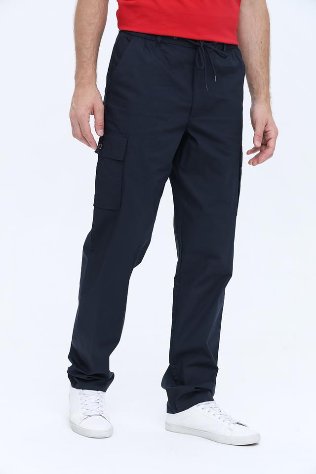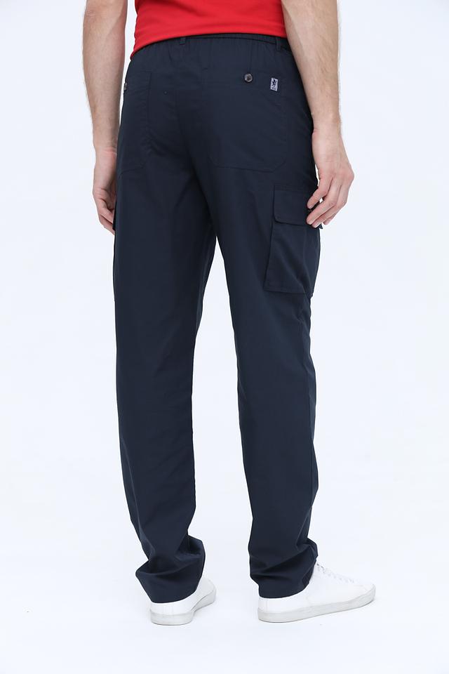 Брюки имеют прямой крой, эластичный пояс с регулирующим шнурком и два боковых кармана. На бедрах расположены накладные карманы с клапанами, что добавляет практичности. Задние карманы также присутствуют.