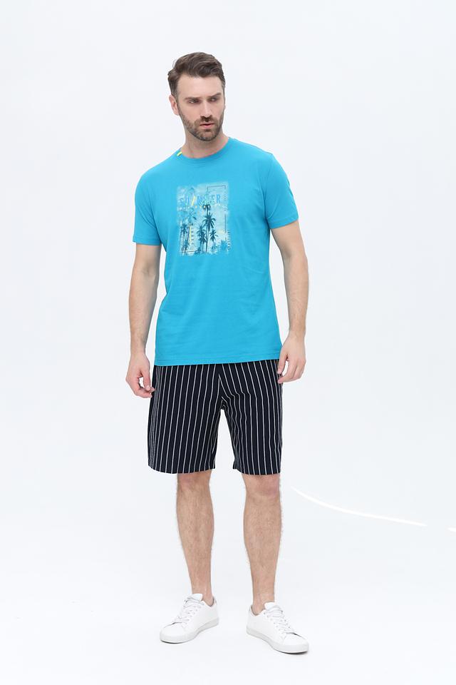 Принт на футболке выполнен в сочетании бирюзовых и белых оттенков, что придает ей свежий и летний вид. Футболка идеально сочетается с шортами, джинсами или брюками, создавая стильный и непринужденный образ.