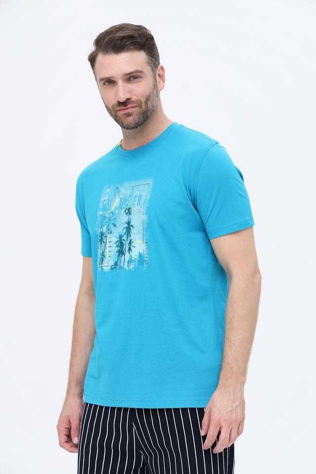 Мужская футболка Sea Barrier выполнена в ярком бирюзовом цвете и украшена стильным принтом с изображением пальм и надписью "SUMMER". Эта футболка станет отличным дополнением к вашему летнему гардеробу.