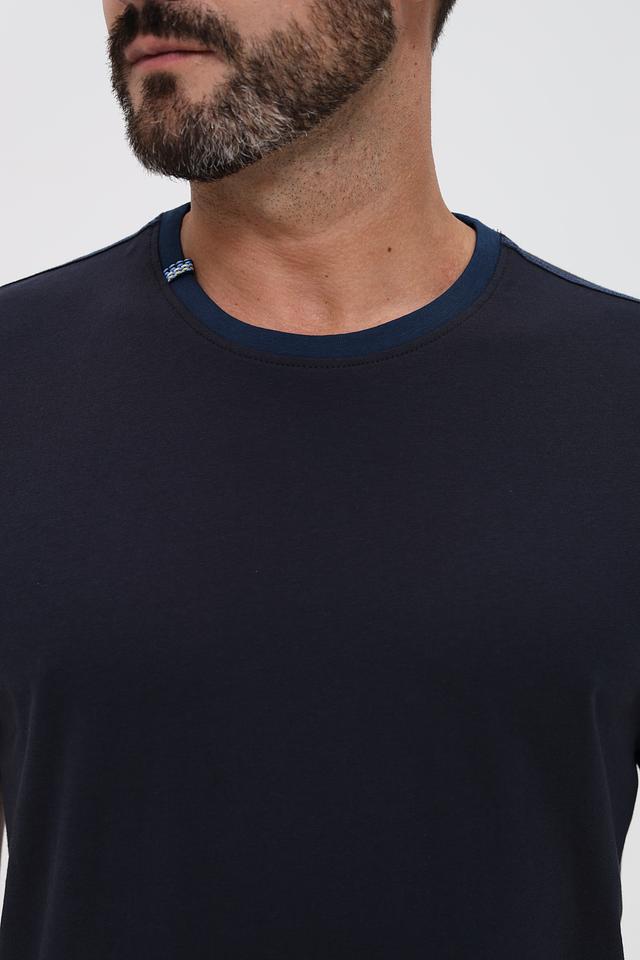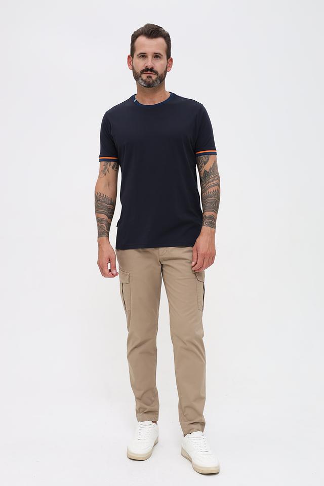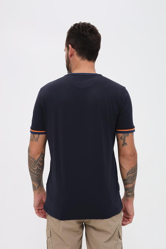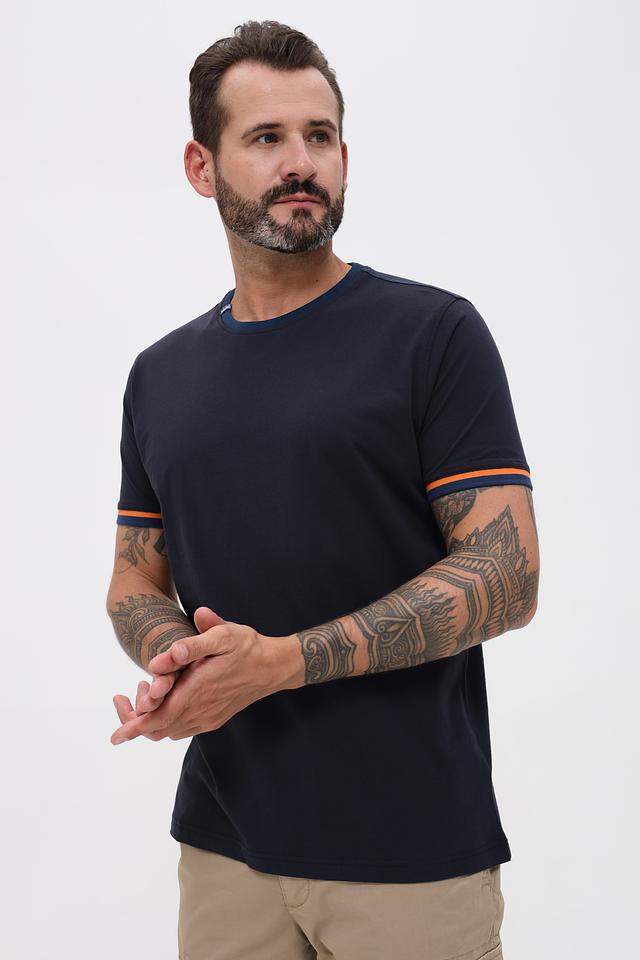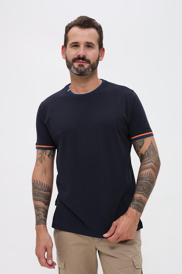 Мужская футболка Sea Barrier тёмно-синего цвета с контрастной оранжевой полоской на рукавах. Изготовлена из 100% хлопка, обеспечивая комфорт и воздухопроницаемость. Стильный и лаконичный дизайн делает эту футболку отличным выбором для повседневной носки. Состав: хлопок 100%