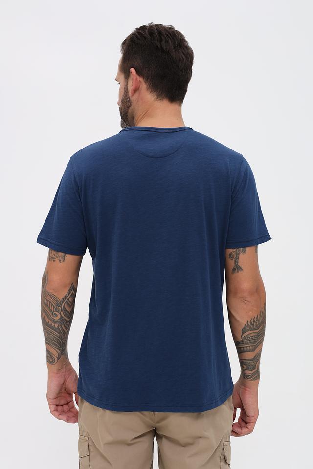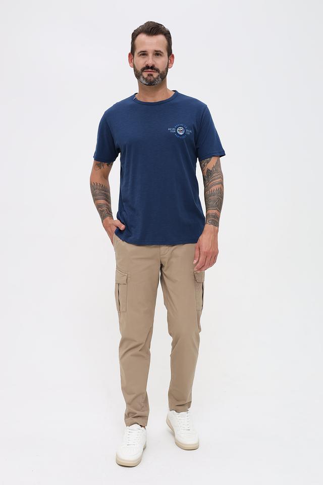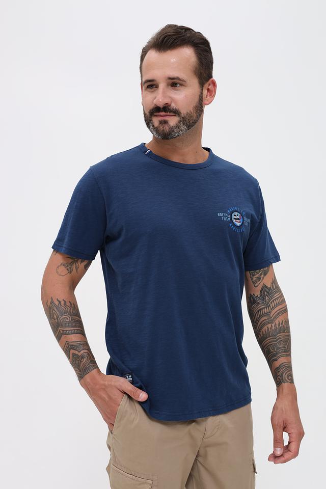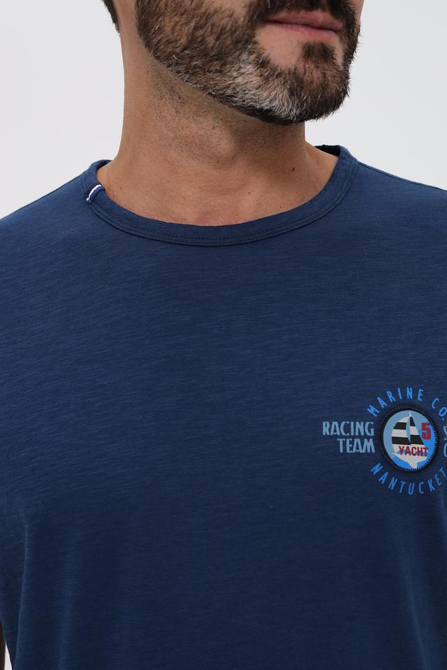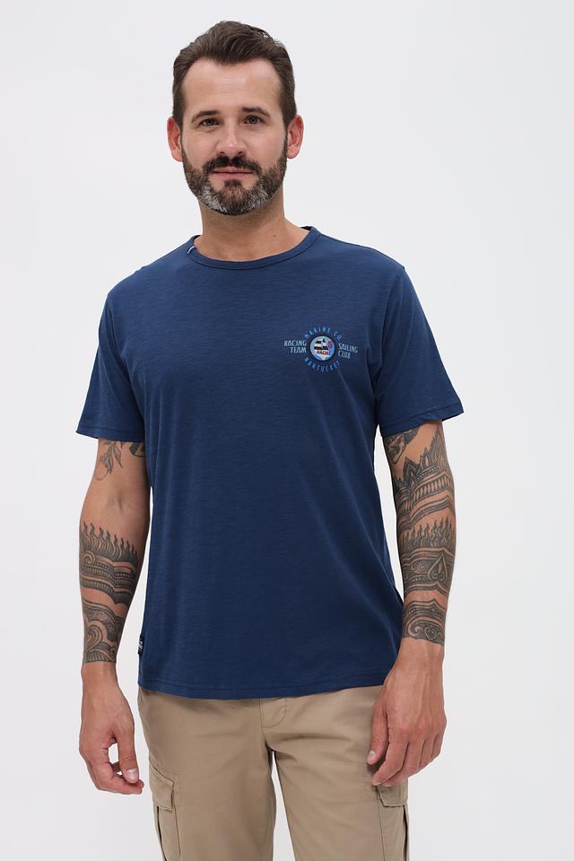 Основной цвет футболки – насыщенный синий. На груди расположен принт с логотипом бренда и морской тематикой, выполненный в белых и красных тонах. Принт добавляет футболке индивидуальности и стиля.