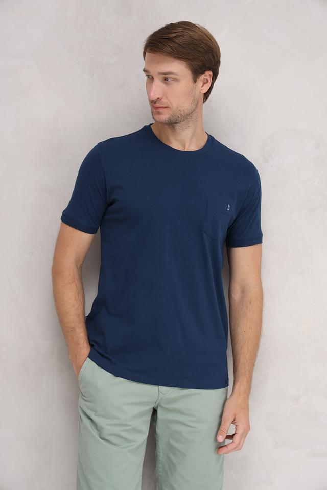 Модель отличается лаконичным дизайном: круглый вырез горловины, короткие рукава и небольшой нагрудный карман. Цвет футболки – насыщенный синий, который легко сочетается с различными элементами гардероба.