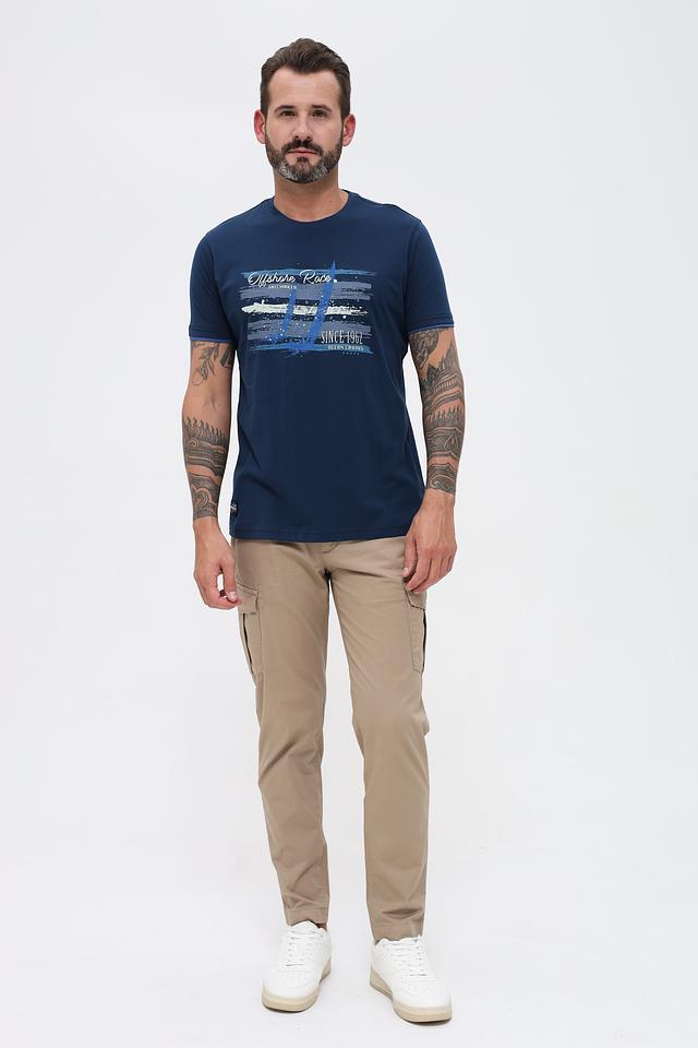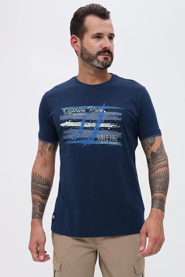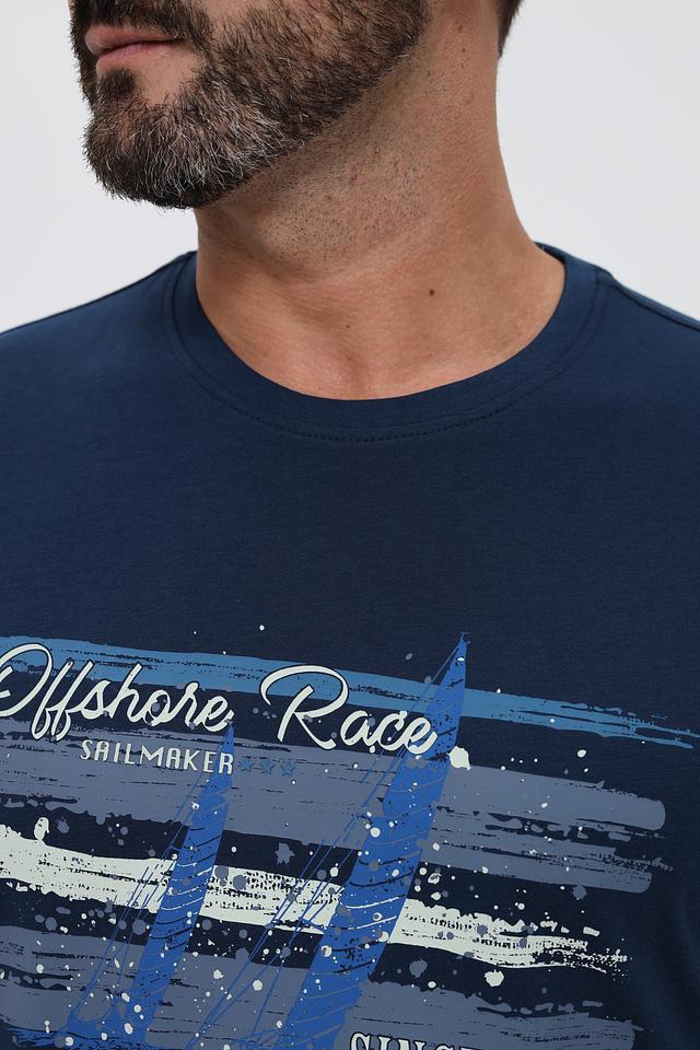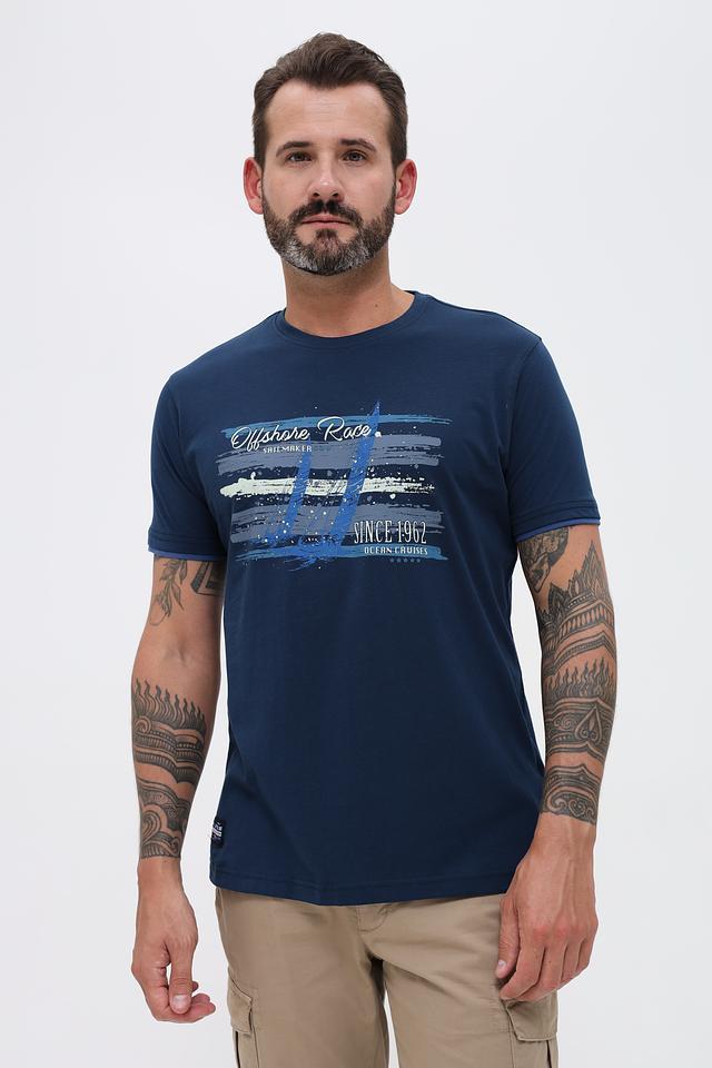 Основной цвет футболки – насыщенный синий, который отлично сочетается с различными элементами одежды. Главная особенность модели – яркий принт с изображением корабля и надписями "Offshore Race", "Sailmaker" и "Since 1962".