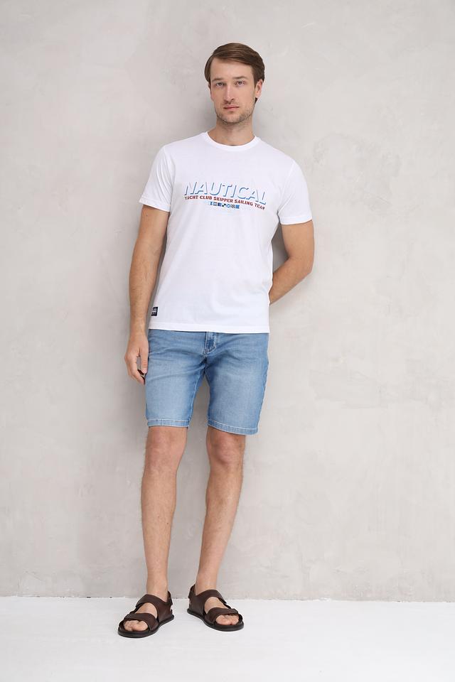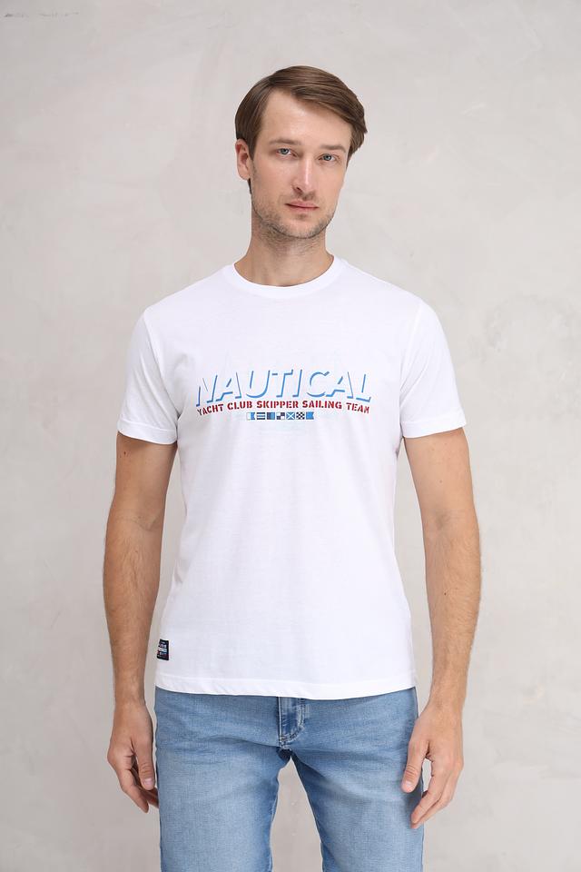 Дизайн футболки украшен ярким принтом "NAUTICAL", включающим надпись и изображение флагов, что придает ей стильный и морской вид. Футболка имеет классический крой и круглый вырез горловины, что делает ее универсальной и подходящей для любого типа фигуры.