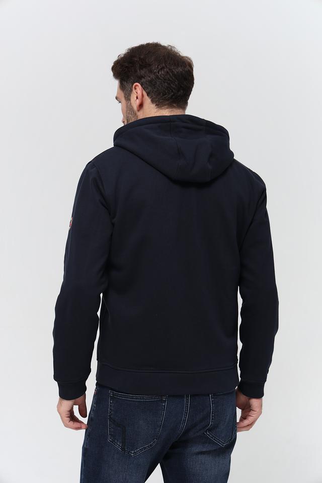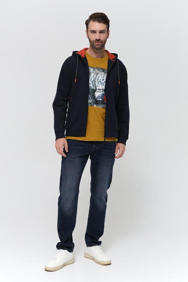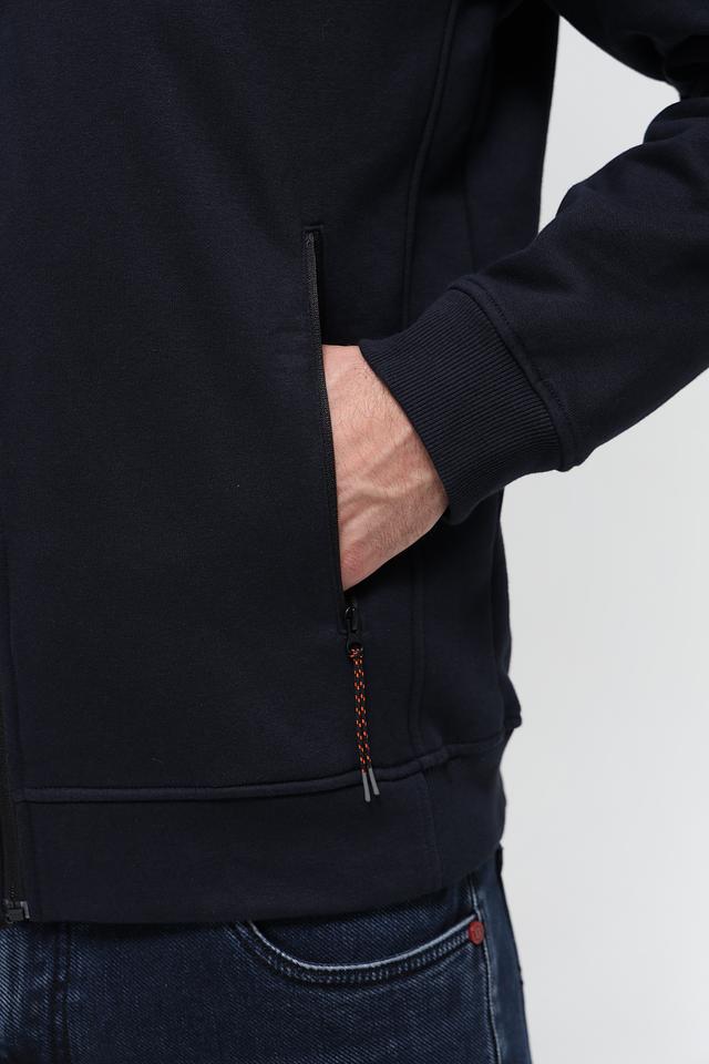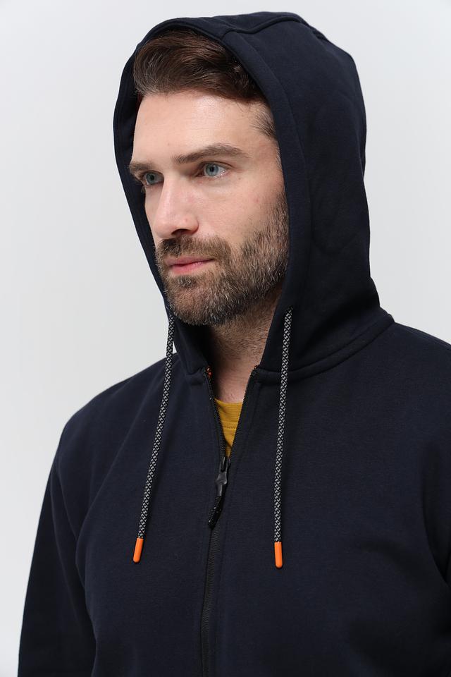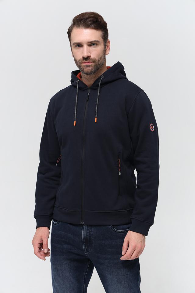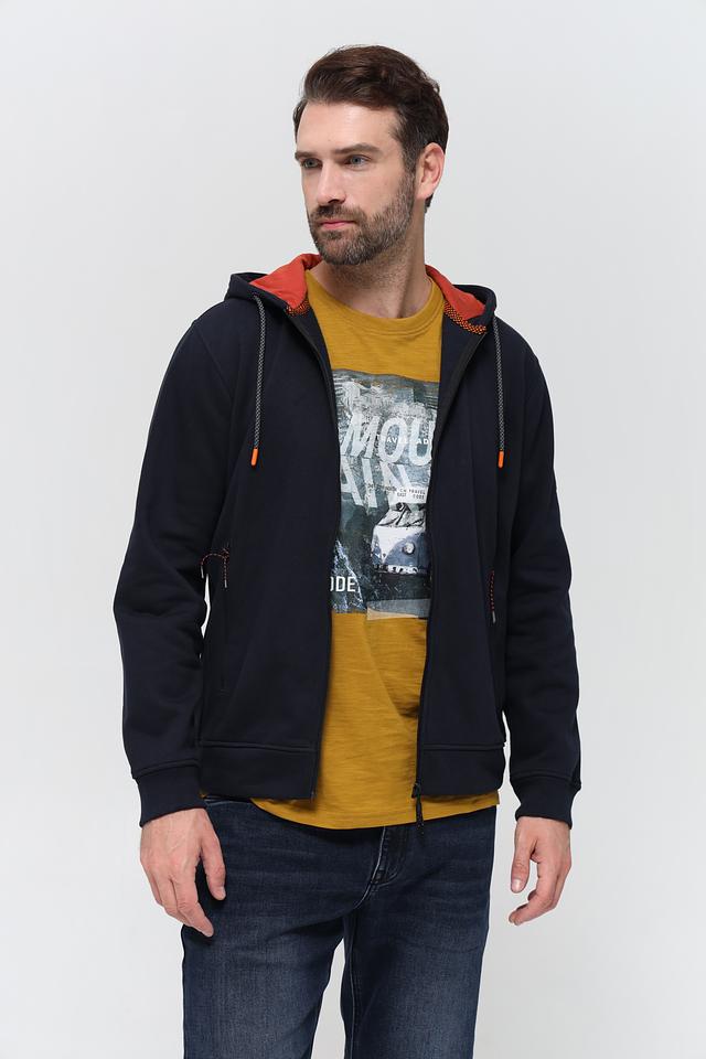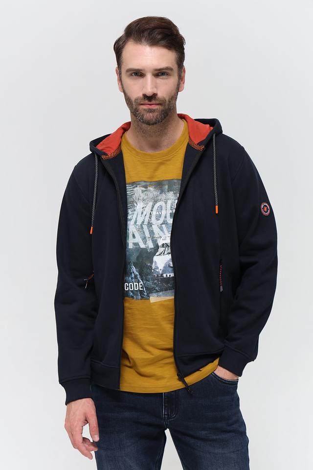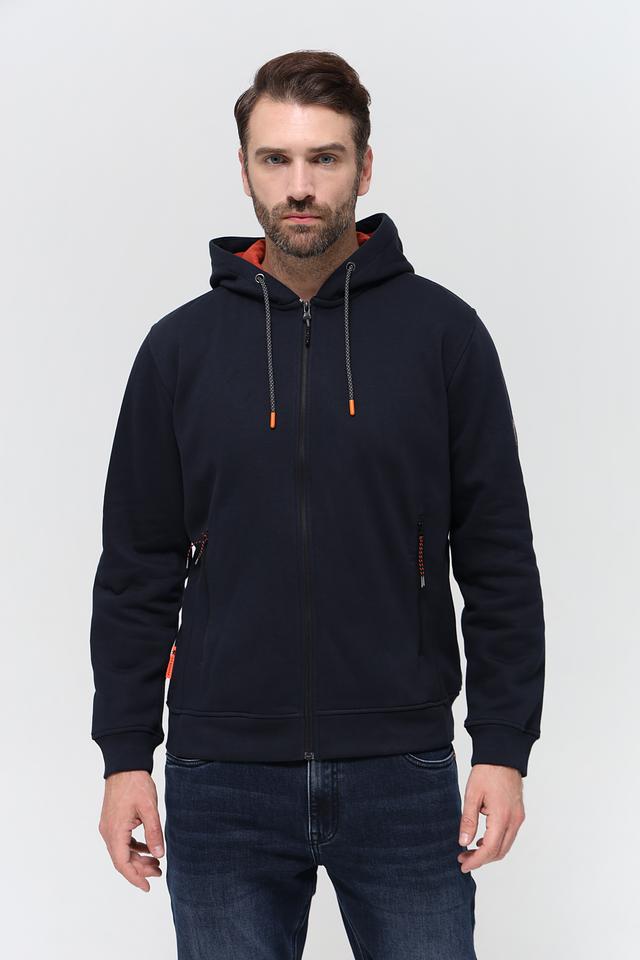 Мужской кардиган Sea Barrier тёмно-синего цвета с капюшоном и контрастной оранжевой подкладкой. Модель на молнии с удобными боковыми карманами и декоративными элементами. Состав: хлопок 70%, полиэстер 30%