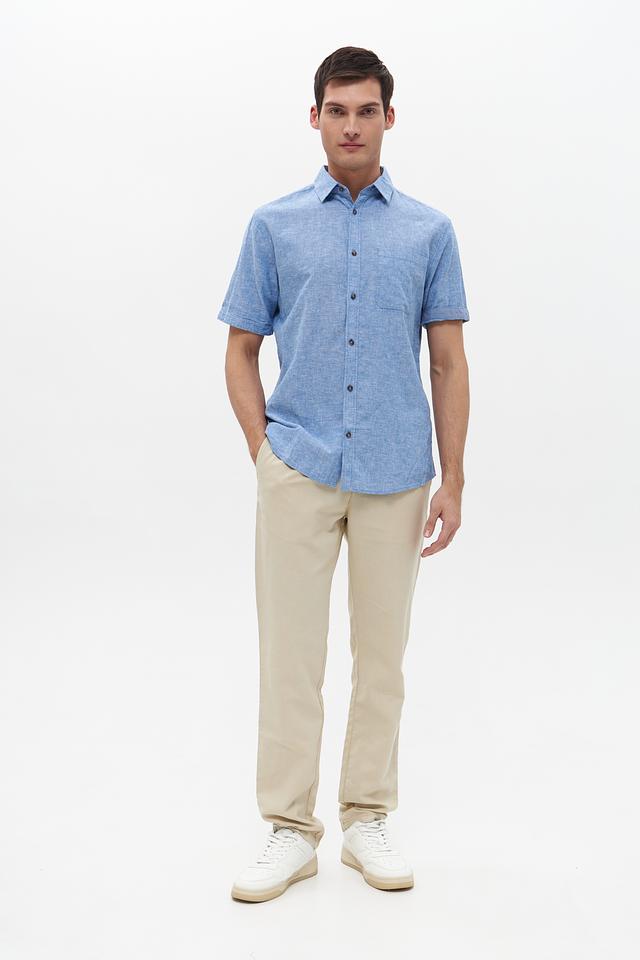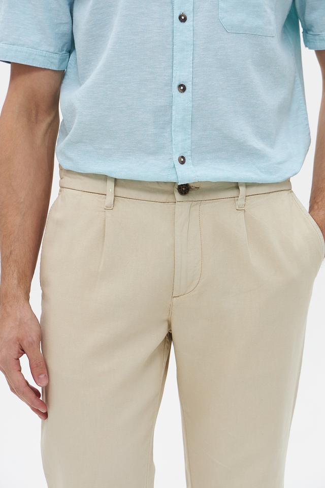Брюки имеют классический крой с прямыми штанинами, что делает их универсальными для различных образов. Ткань состоит из хлопка, лиоцелла и льна, обеспечивая воздухопроницаемость и приятные тактильные ощущения. Состав: хлопок 64%, лиоцел 25%, лен 11%.