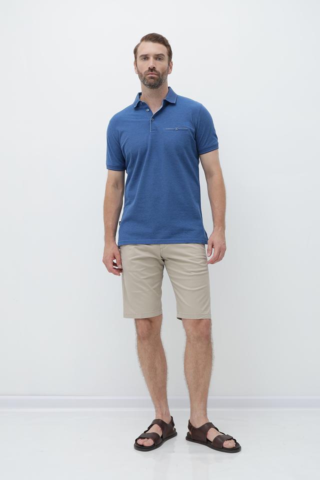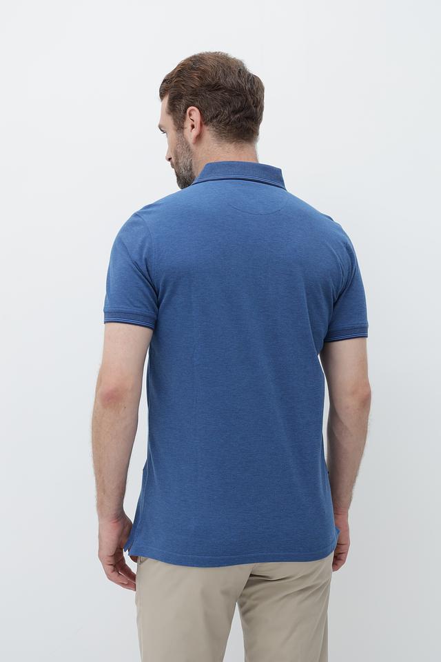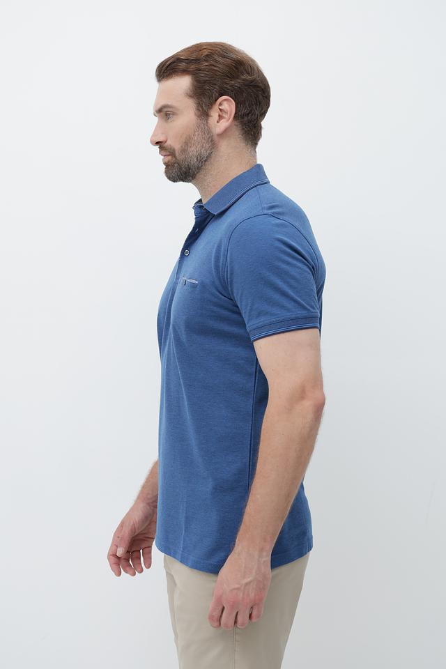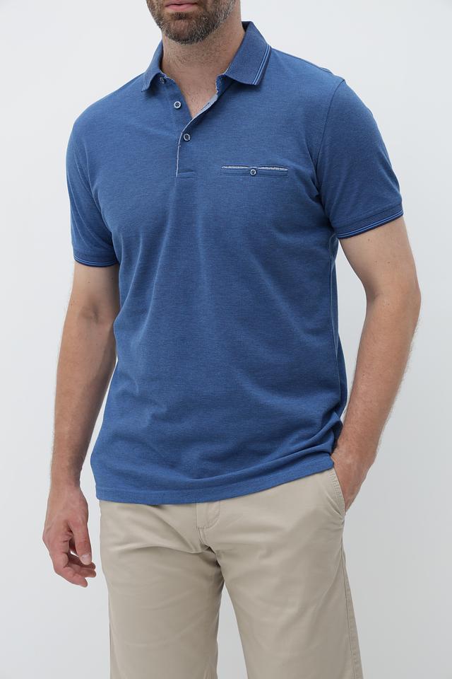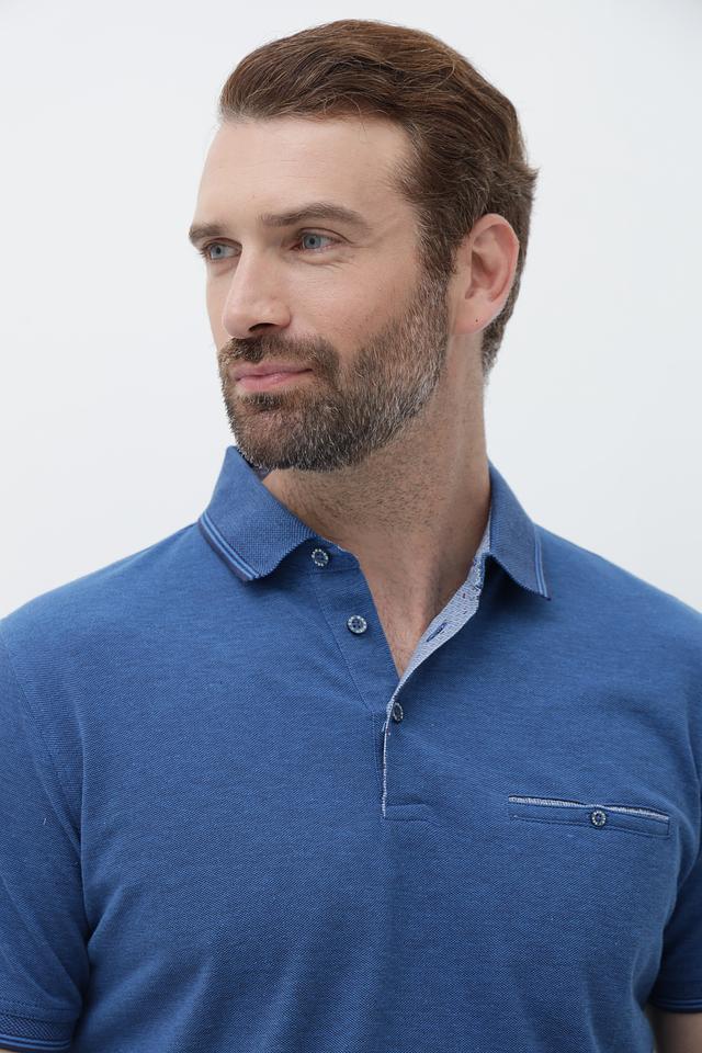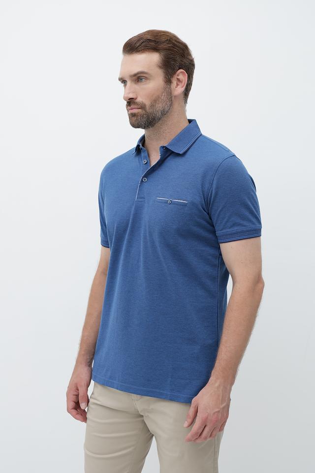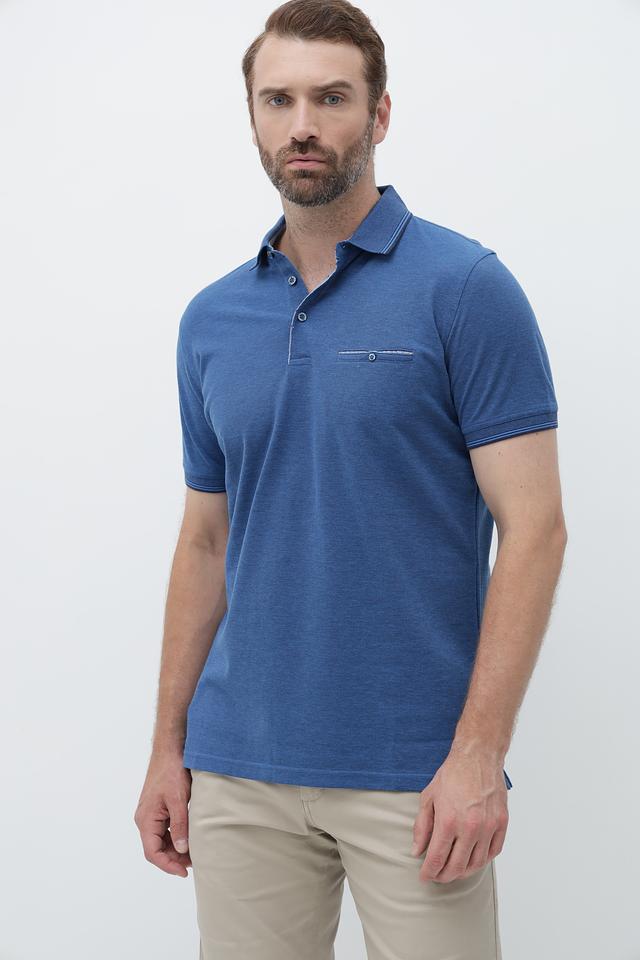 Поло выполнено в насыщенном синем цвете, который легко сочетается с другими элементами гардероба. На груди расположена накладная планка с небольшим контрастным кантом, добавляющая поло индивидуальности. Воротник выполнен из эластичного трикотажа, обеспечивающего удобную посадку.