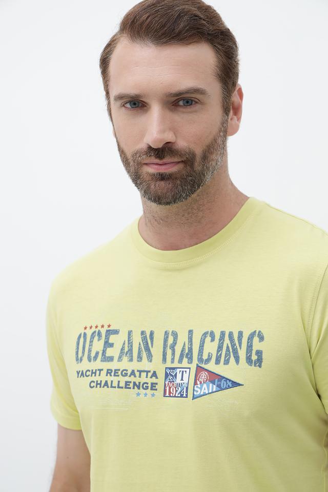 Мужская футболка Sea Barrier светло-жёлтого цвета с ярким принтом "Ocean Racing". Изготовлена из 100% хлопка, обеспечивающего комфорт и воздухопроницаемость. Состав: хлопок 100%