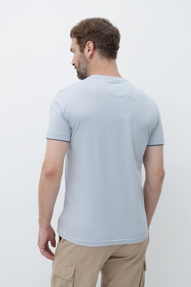 Небольшая синяя полоска вдоль горловины добавляет акцент и завершает образ. Эта футболка станет отличным выбором для тех, кто ценит комфорт, стиль и качество.
