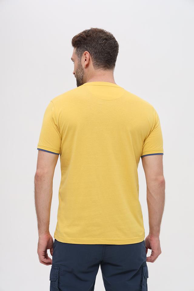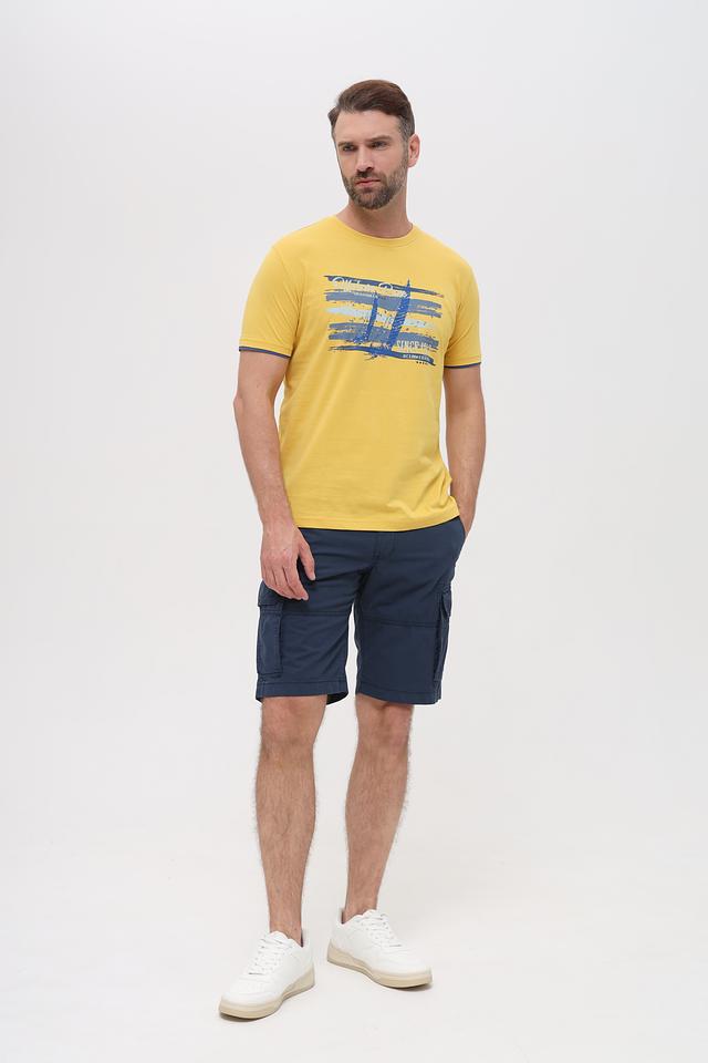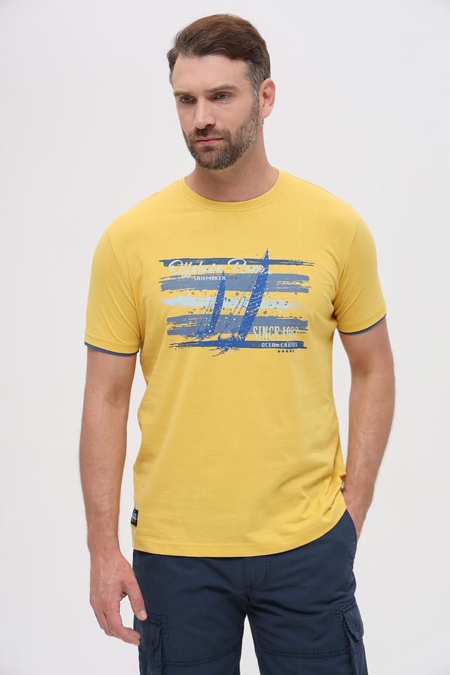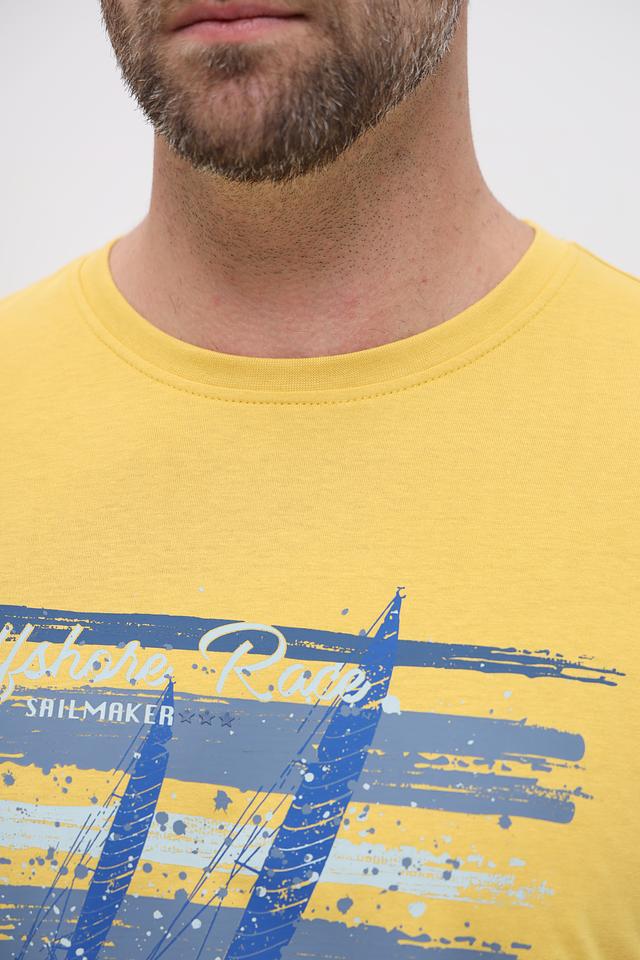 Яркий жёлтый цвет и оригинальный принт с изображением парусника придают футболке стильный и современный вид. Округлый вырез горловины и короткие рукава делают её идеальной для тёплой погоды.