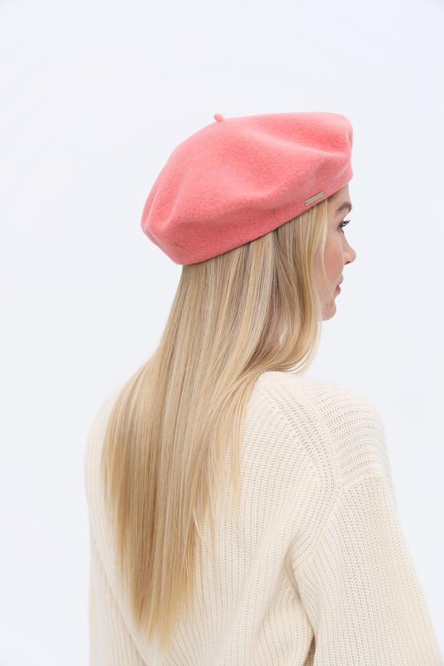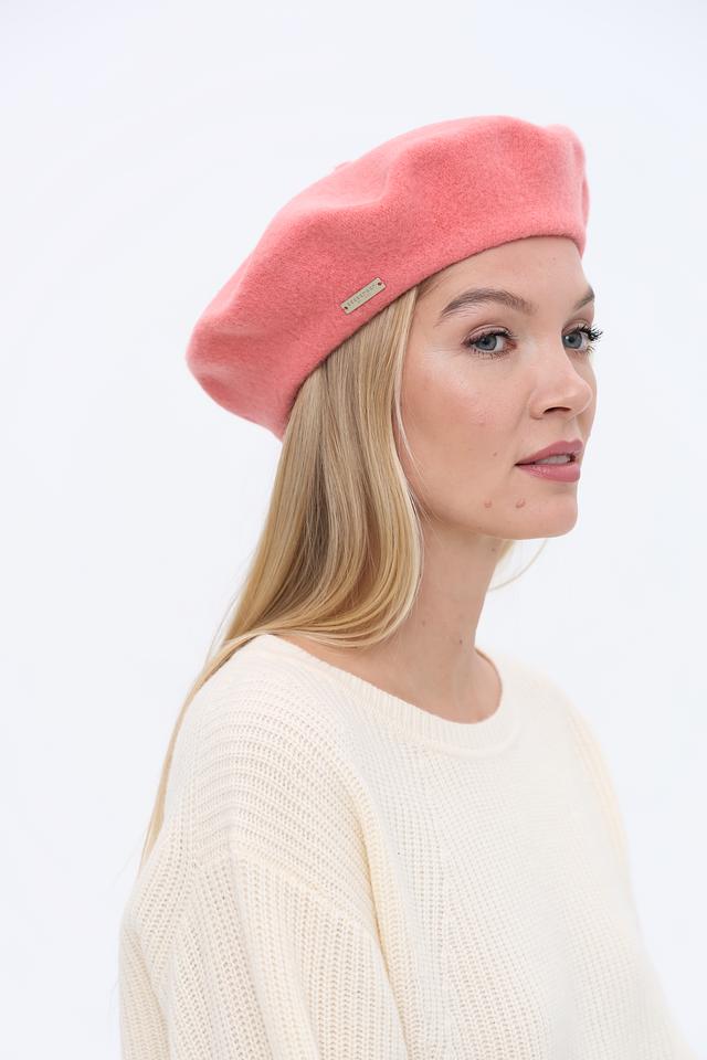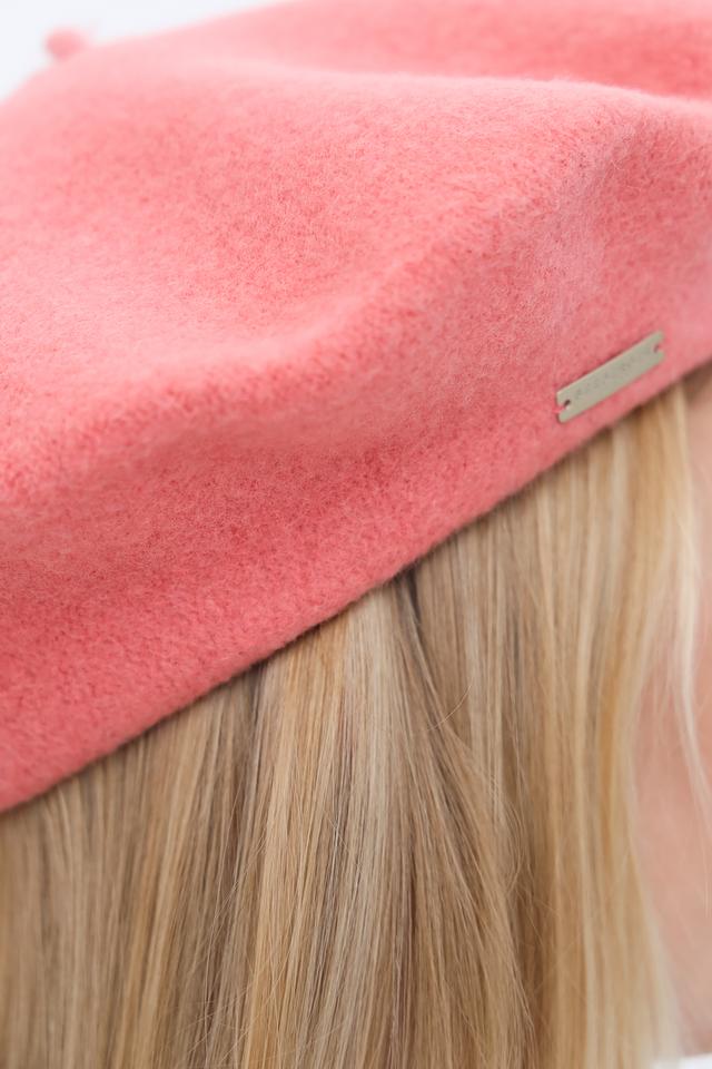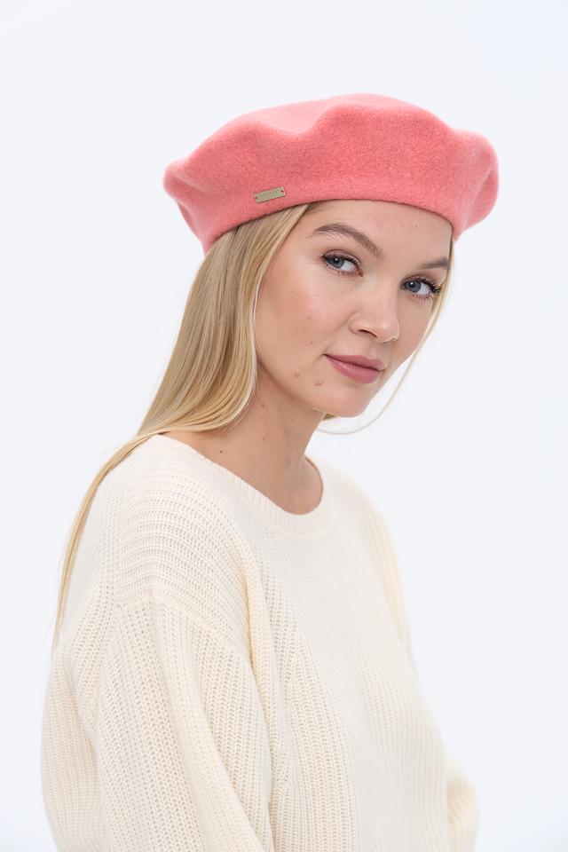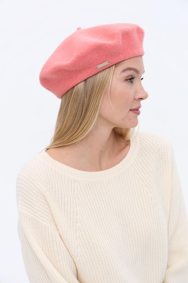 Берет имеет классическую форму и нежный розовый цвет, который легко сочетается с различными стилями одежды. Аккуратный шов по краю изделия придает ему завершенный вид. Небольшой металлический логотип бренда деликатно размещен сбоку.