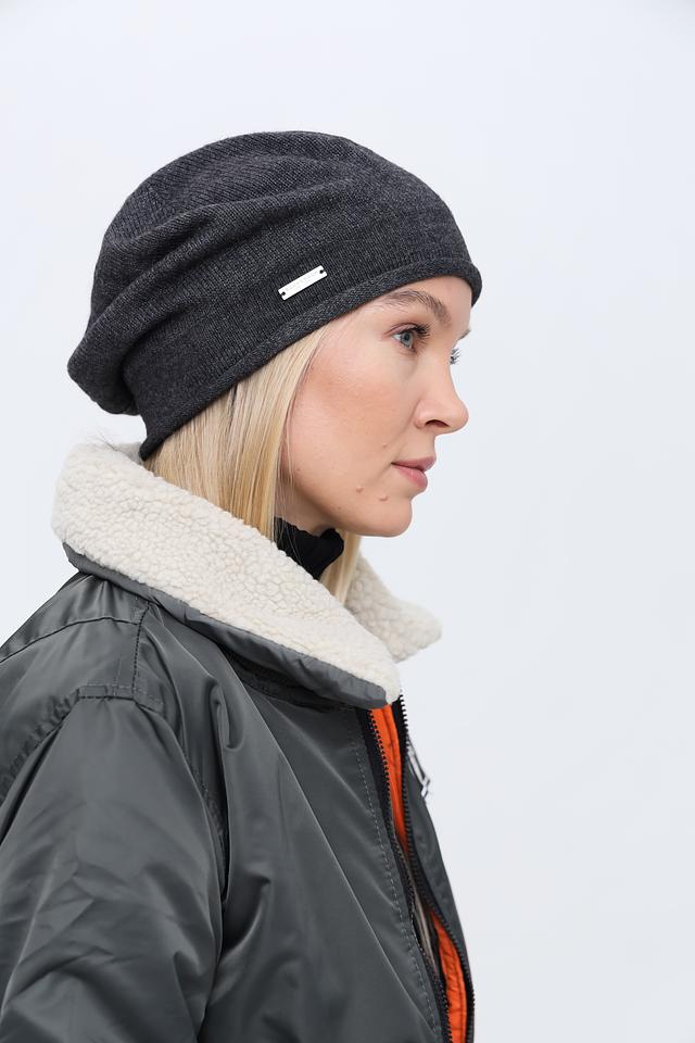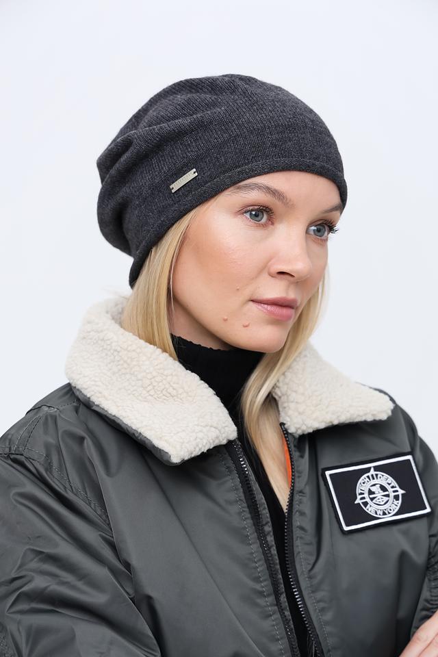 Шапка имеет классический дизайн и универсальный серый цвет, который легко сочетается с различными стилями одежды. Особенностью модели является декоративная металлическая планка с логотипом бренда, которая придает шапке элегантный вид.